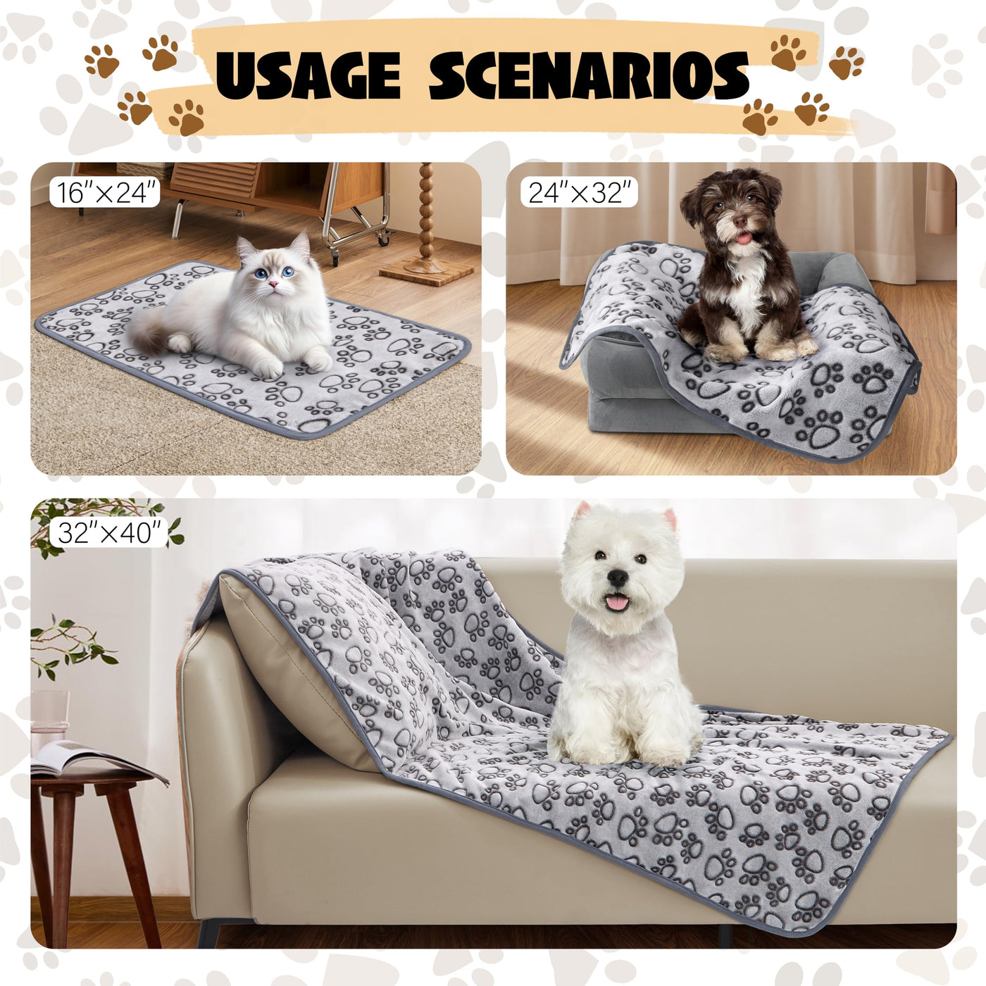 Q: What sizes are available for the dog blankets?A: Our dog blankets come in three sizes: Small (24 x 16 inches), Medium (32 x 24 inches), and Large (40 x 32 inches), ensuring the perfect fit for small dogs, puppies, and cats.