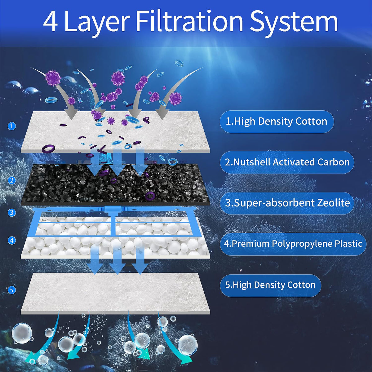 ???Four-Stage Filtration?The filter cartridge is made of dense dual-sided mesh Better thickness provides better filtration Ultra-Activated carbon instead of ordinary carbon and also add processed zeolite which can effectively filter and absorb impurities in the water to keep the clean water source and provide the healthy growth environment for fish
