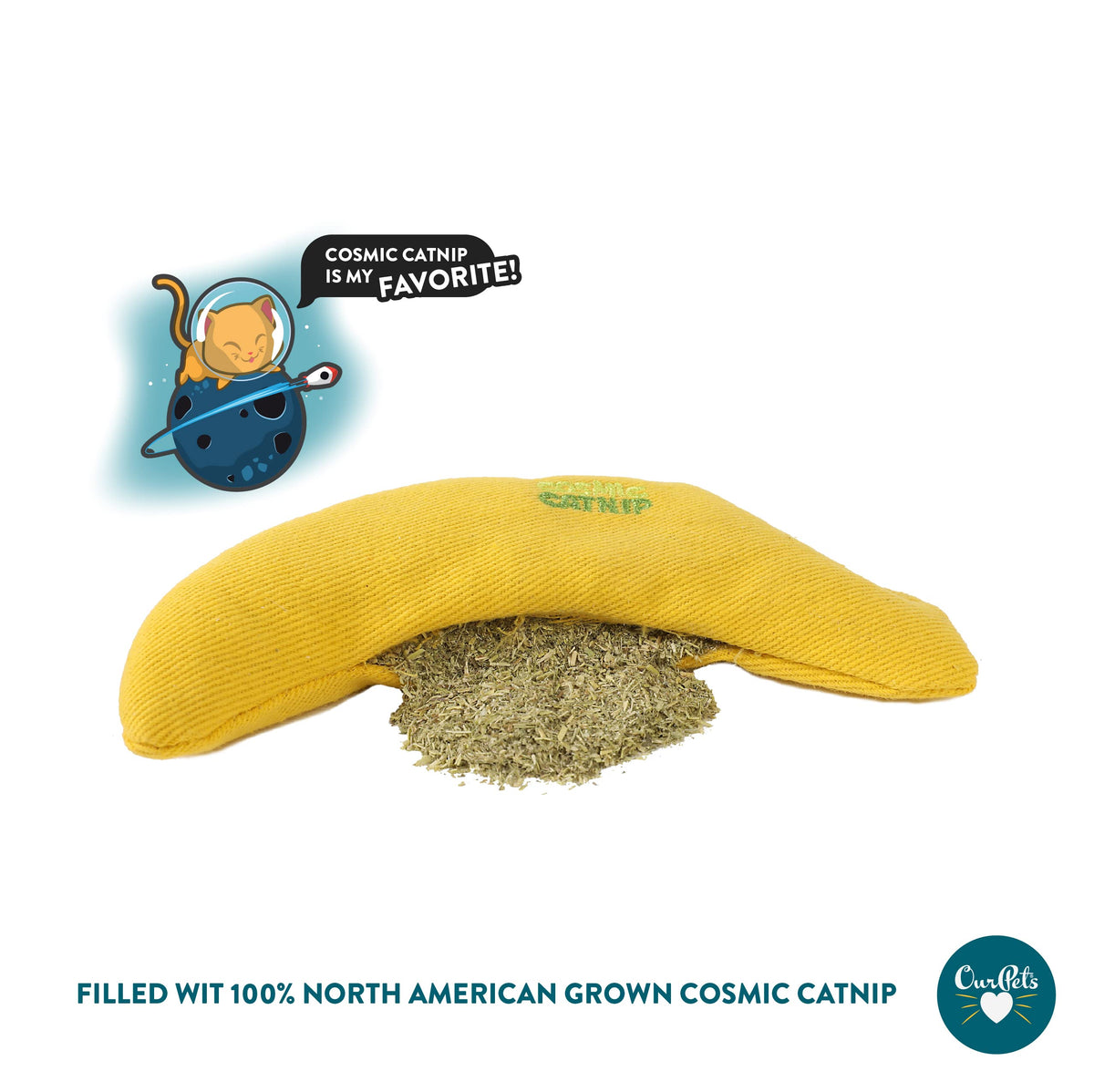 CATNIP FILLED: OurPets North-American-grown Cosmic Catnip has been grown to achieve the strongest most aromatic catnip ever produced. When catnip is pinched the aroma stored in the dried leaves is released driving cats wild. Catnip is a 100 percent natural herb that stimulates a harmless playful reaction in most cats.