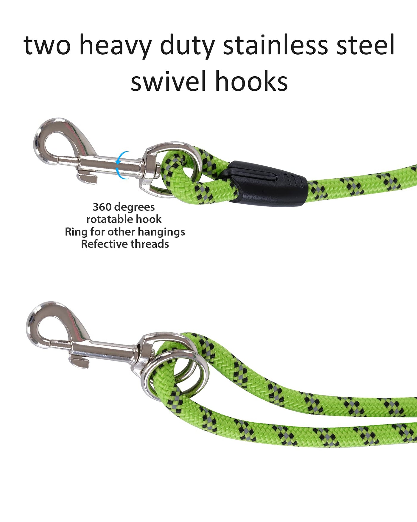 Dog Tie Out Cable: Both ends of our rope dog leash has a heavy duty stainless steel swivel hook that can rotate 360 degree. You can tie one end of this long line lead to your body or trees etc. so that you can free your hands when walking traning hiking playing outside.