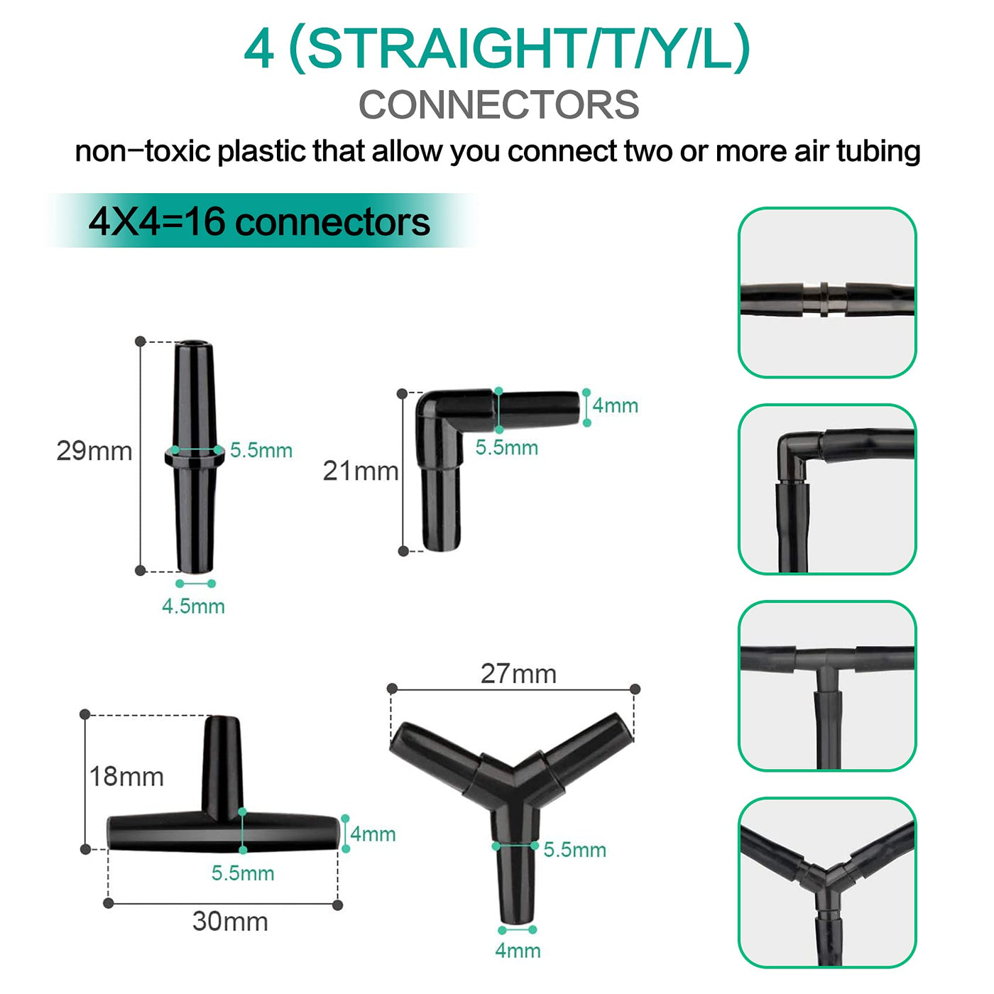 4 pieces ''F'' type Aquarium Fish Tank Air Flow Controller and 4 Aquarium Control Valves barb X barb with bigger controller cap that both can control the air volume for aquarium air stone.16 pieces in total for I L T Y shape air pump tubing connectors which is 4 pieces I shape 4 pieces L shape 4 pieces T shape and 4 pieces Y shape
