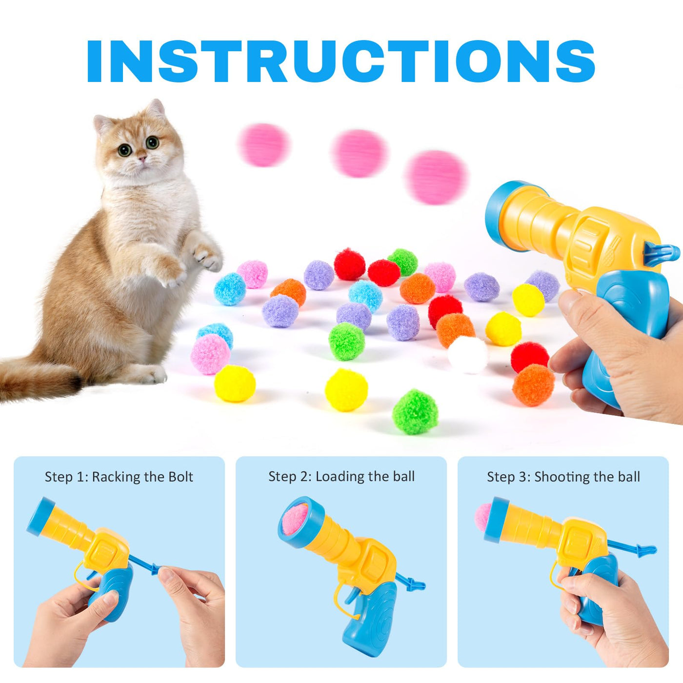 102Pcs Cat Toy Gun Launcher - 100 Sparkle Pom Pom Balls And 2 Ball Launchers, Interactive Fetch Toy Shooter For Indoor Cats And