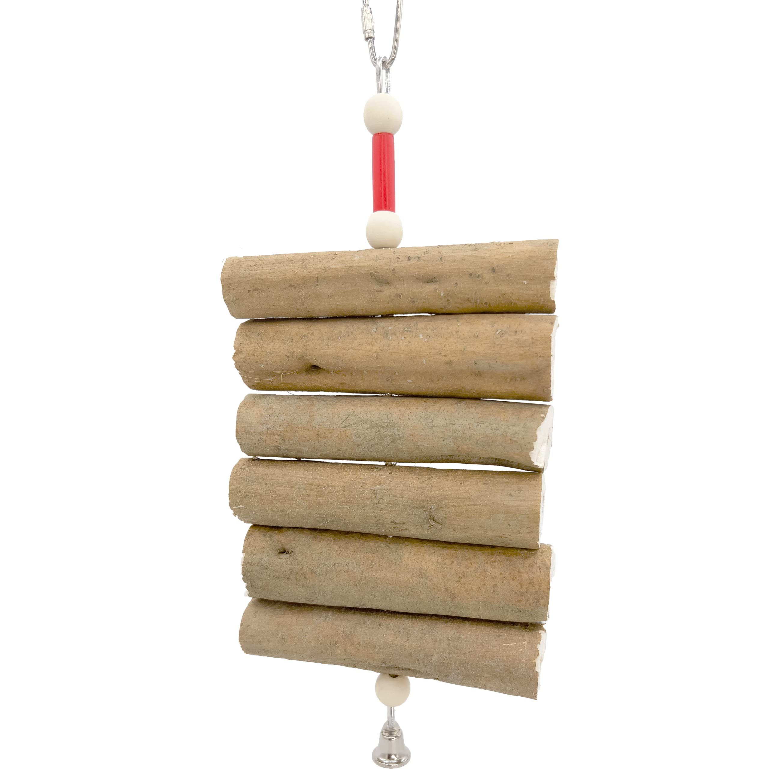 The 1068 Big Bark Sola Chewer From M&M Bird Toys Is A Fun To Shred Hanging Toy. This Bird Toy Is A Foraging Indulgence And Can Change Its Shape Easily. At The Top Of This Bird Toy Is A Quick Link Connector Making For Fast Hanging In The Aviary. From Here A Sturdy Metal Wire Wraps Around The Connector And Continues Through The Center Of The Toy Working As Its Backbone. On The Bottom This Wire Has Been Made Into Another Loop That Hangs A Small Metal Bell. On Top The Wire Has Been Adorned With (2) Natural Wooden Beads And A Colorful Plastic Straw. Sitting Under The Bead Are (6) Large Sola Logs With Bark. These Parts Are Made From Air Dried Pieces Of Sola Wood And Are All Natural. The Bark Is Easy For Pets To Peel Off And The Logs Are Great Fun To Chew. The Logs Can Also Be Spun Around On Their Axis Letting The Toys Shape Change Quickly. On The Bottom There Is Another Natural Wooden Bead Before The Metal Bell. This Bird Toy Is A Wonderful Addition To Any Cage That Needs A Chewable Hanging Toy. The Pleasant Shape Of The Toy Makes It Appealing To All Breeds Of Pets. The Lightweight Sola Material Is Easy And Enjoyable To Chew Apart. This Toy Provides A Wonderful Way For Pet Birds To Express Their Natural Foraging Nature Which Is To Chew, Shred And Break Apart. This Hand-Crafted Bird Toy Varies Slightly In The Size Of The Sola Logs As They Are Natural Items. [Specifications] Height: (11) Inches Or (27.94) Cm Width: (5) Inches Or (12.7) Cm Depth: (1.25) Inches Or (3.17) Cm Weight: Under (2) Ounces A Bird Safe Chewing Cage Toy Individually Hand-Crafted By Mai In Our Small Florida Shop