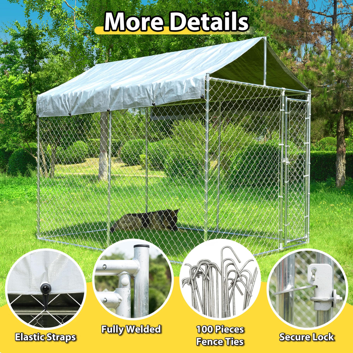 ???Heavy Duty Made?:Upgraded Large Dog Kennel Outdoor Made Of 1.25'' Galvanized Metal Tube And 2.5 Mm Thicker Steel Wire Mesh, Solid And Rust-Proof, More Durable Than Other Products On The Market. Raised Legs Can Be Inserted Into The Ground Outdoors To Hold The Cage In Place For Added Stability. ???Large Space For Dog Play?:Large Dog Kennel For Small To Large Dogs, With Roof Size: 6'L X 10'W X 7.65'H, Giving Your Lovely Pet Enough Secure Space To Exercise And Play, Don'T Need To Worry About Your Pet Getting Depressed From Being Locked Up All Day! ???Easy Installation?This Outside Dog Kennels Is A Diy Kit That Comes Totally Unassembled, About 1 Hour For 2 People To Assemble. We Have Prepared A Detailed Manual In The Package, Please Read It Carefully Before The Whole Installation Process. ??Waterproof Removable Cover?:Uv-Protected And Waterproof Dog Kennels Cover Made Of Durable Oxford Fabric With Silver Coating, Sgs Anti-Uv Tested, No Ripping And Fading, Giving You Years Of Worry-Free Use. Besides, The Roof Can Be Easily Removed, Allowing The Outdoor Dog Run Also To Be Used As A Dog Fence.