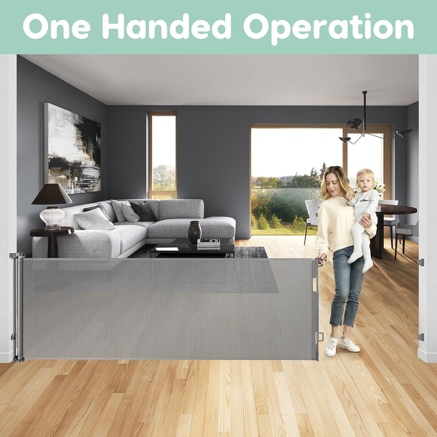 115 Inch Outdoor Retractable Gate : extra wide retractable baby gates is 35 inches tall and can be extended to fit openings 0-115 inches. Mesh can be completely retracted away when not in use. Indoor / Outdoor Gate : extra large baby gate can be used indoors and outdoors, such as in bottom of stairs, doorways, hallways, fireplaces, front doors, porches, garage doors, decks, patios. Baby / Dog Gate : extra wide baby gates for large openings is suitable for babies and dogs. provide a safe environment for your babies and pets. Easy to Use : double locking mechanism make it easy to open for adults, but difficult for babies and pets. No Trip Hazard & Blend Into Your Home Style : theres no threshold at the bottom of the wide gate so theres no tripping risk. Extra long baby gates for large openings can be integrated into your home style. Standard Approved : all extra wide dog gate lines are tested to the safety standards, meeting or exceeding both ASTM or EM standards.