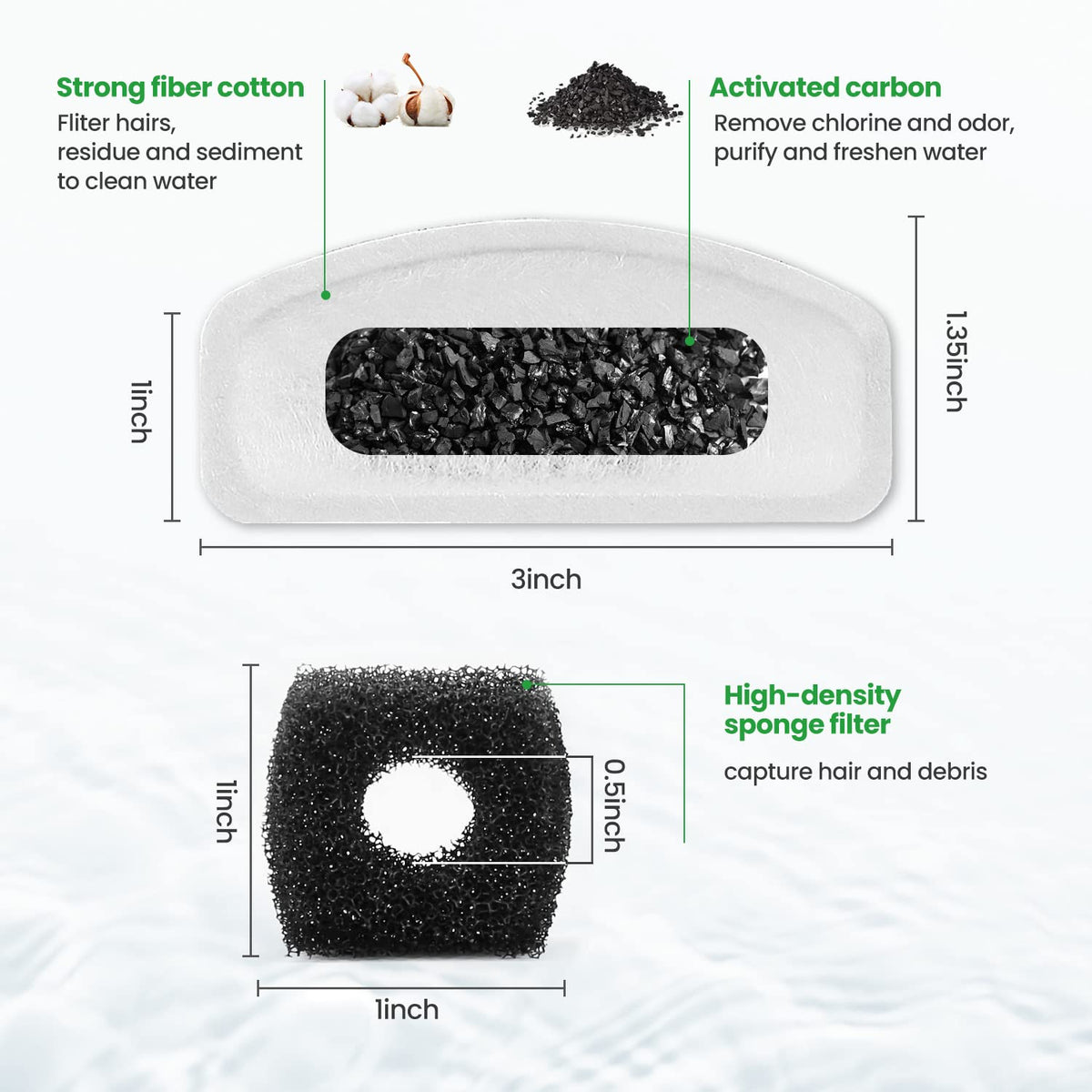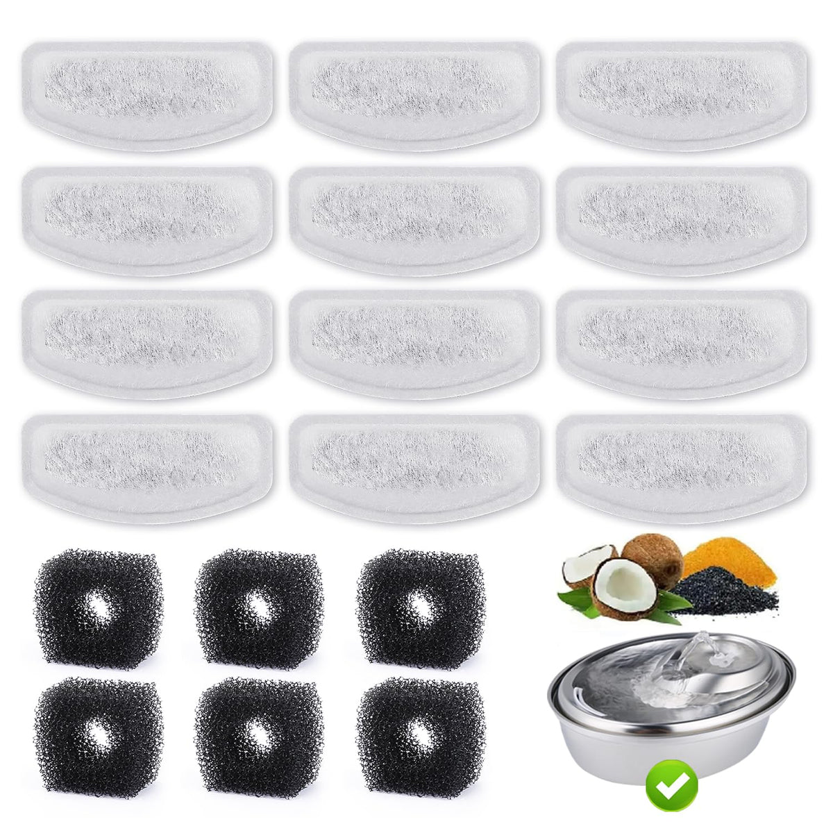 ZEKIRY was founded in 2016 in China, in the belief that our beloved pets should be taken good care of. We are committed to providing the best products to help you keep your pets happy and healthy. Features: Customer service: 12-Month return & refund policy and 24-hour customer service. Compatibility: ONLY Compatible with 67oz/2L stainless steel automatic pet water fountain. 3 Layer filtration system: High density cotton mesh layer fliter hairs and residue, keep water clean; Activated carbon powder layer remove chlorine and odor, purify and freshen water; Strong fiber cotton, filter the residue again. High density pump sponge: capture hair and debris, and prevent them entering the water pump, extend the life time of your fountain pump. Size: Replacement filter: 1 inch * 3inch, 1.35inch the widest Replacement sponge: 1inch * 1inch, 0.5inch circular diameter Material: Replacement Filter: High density cotton mesh+activated carbon Replacement sponge: High-density sponge Package List: Replacement filter * 12 Replacement sponge * 6