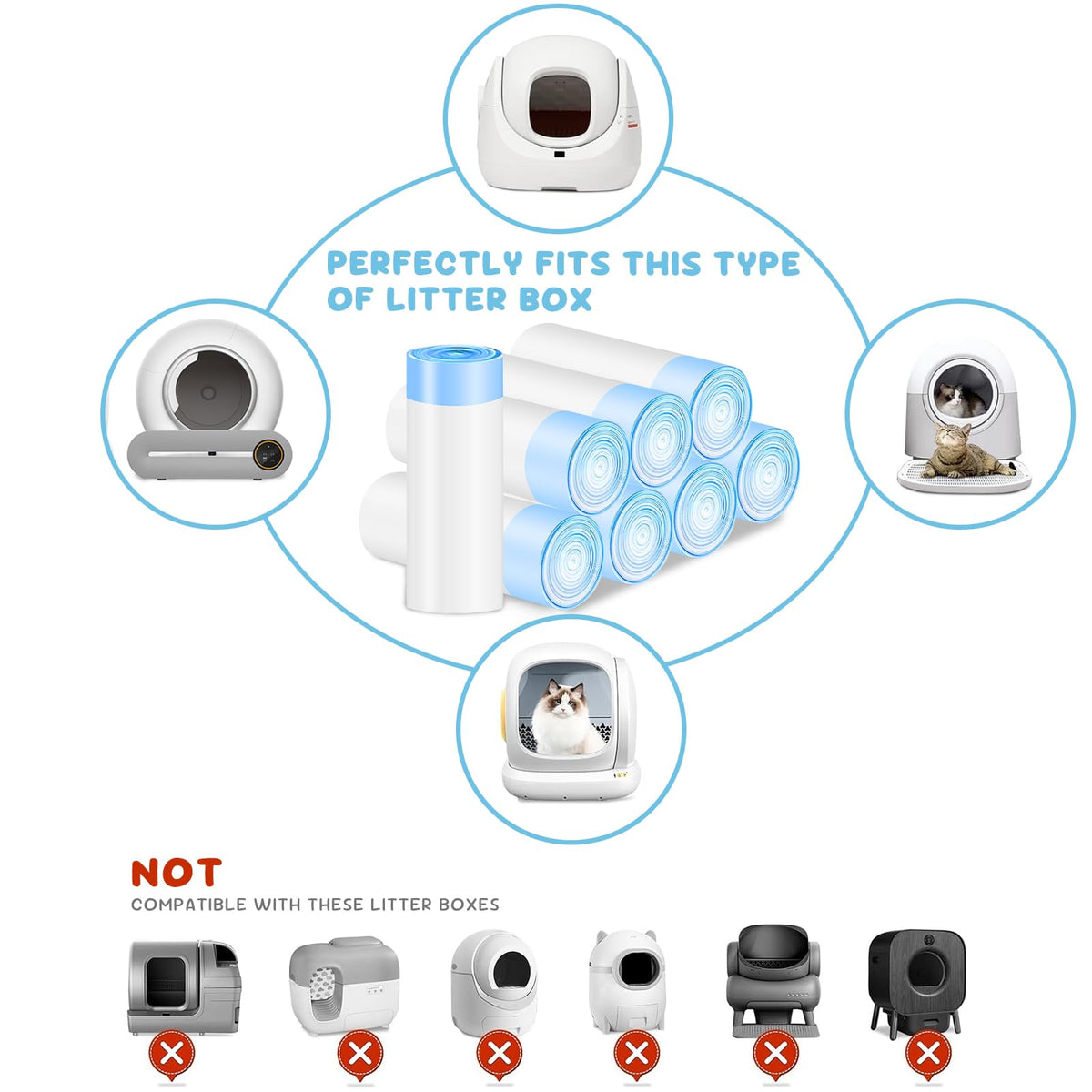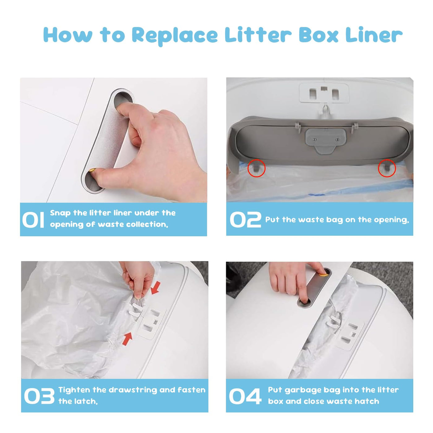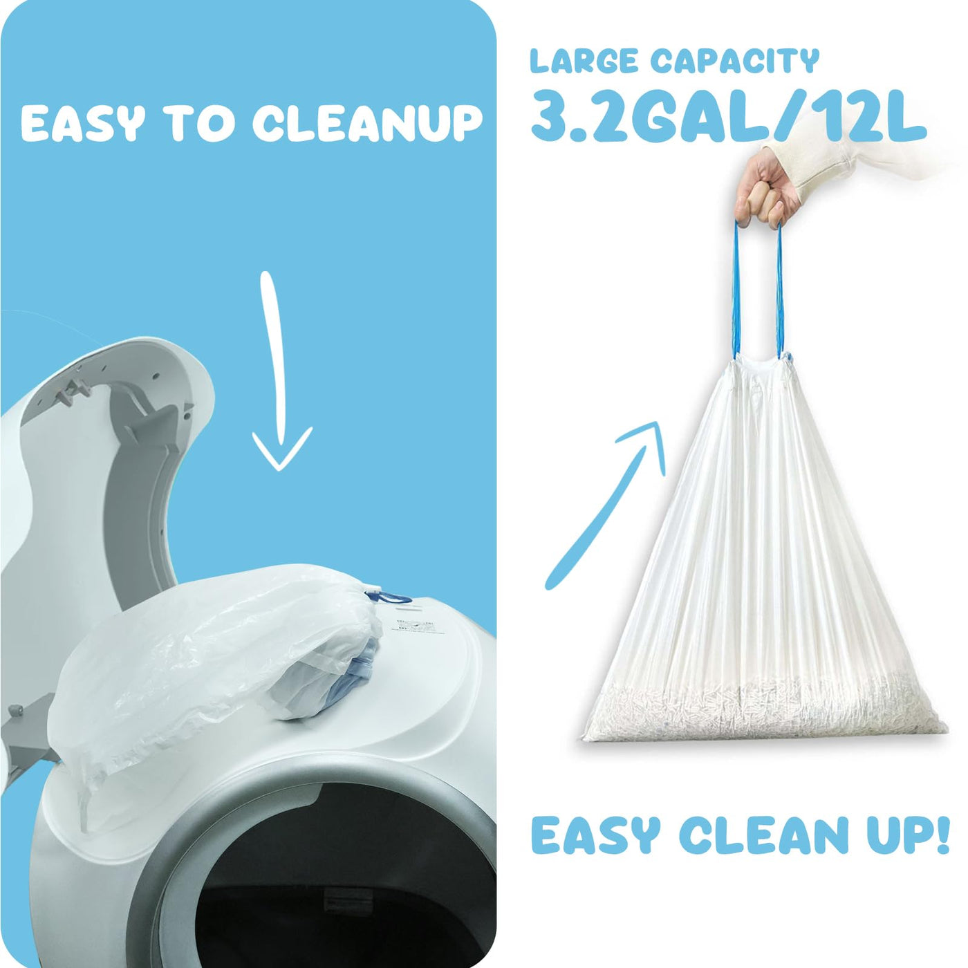 As A Pet Cat Owner, Do You Have Below Frustrations? 1. Cleaning The Litter Box Is A Hassle. 2. Clumps Stick To The Bottom And Are Hard To Remove. 3. Garbage Bags Tear Easily. 4. Litter Gets Scattered Everywhere. 5. Inconvenient To Carry Around. 6. Waste Bag Lack Of Handles, Making Difficult To Hold. Why Choose Our Litter Liners? 1. Compatibility Fit For: Designed For Most Automatic Self-Cleaning Litter Box To Ensure High Performance, Leak Proof & Heavy Duty. 2. Durability: These Reusable Litter Liners Reduce Waste By Lasting Longer Than Other Liner Replacement. 3. Easy To Installation: Simply Wrap The Edges Of The Liner Over The Rim Of The Opening Of Waste Storage And Tighten The Rope Of The Waste Bag. 4. Easy To Cleanup: It Cleans Easily, Clumps, And Removes Easily. These Trash Bags Are Great For Litter. Features: 1. Custom Fit For Self-Cleaning Litter Boxes Designed Specifically For Automatic Self-Cleaning Cat Litter Boxes, These 17.7'' X 19.7'' (45Cm X 50Cm) Liners Seamlessly Fit 10-12L Litter Box Systems. Avoid Leaks, Jams, Or Misalignment During Cleaning. 2. Leak Proof & Heavy Duty Made From Plastic Material, These Liners Are 30% Heavy Duty Than Standard Options. Reinforced Seams And Anti-Tear Technology Prevent Messy Leaks, Even With Heavy Clumping Litter Or Multi-Cat Households. 3. Upgraded Drawstring Closure Quickly Seal Waste With The Easy-Pull Drawstring Design - No Need To Touch Waste! Tight Closure Locks Odors In And Ensures Hassle-Free Disposal. 4. Abundant Quantity For Extended Use Each Package Contains 120 Count Pet Waste Bags, Organized Into 8 Rolls For Convenient Dispensing. With Individual Bag Dimensions Of 19.7 X 17.7 Inches (50 X 45 Cm) And 3.2 Gallon (12L) Capacity, And Our Cat Litter Disposal Bags Provide A Generous Supply To Meet Your Pet'S Daily Use. 5. Functionality & Cost-Effective Works With Open-Top, Enclosed, Or Smart Cat Litter Boxes. Doubles As A Heavy Duty Trash Bag For Pet Waste, Diapers, Or Household Use. Specifications: Waste Bag Dimensions: 17.7 X 19.7 Inches (45Cm X 50Cm) Quantity: 8 Rolls / 120 Count Liner Capacity: 3.2 Gallon (12L) Material: Plastic About Litter Liner: Dot-Break Design For Easy Tearing And Immediate Use, Locate The Bag Notch To Grasp The Drawstring, Convenient To Use, Resistant To Dripping And Leakage, Puncture-Resistant, Constant Temperature Heat-Sealing Technology, Leak-Proof, Compatible With Various Bucket Types, Strong Load-Bearing Capacity For Easy Cleaning, Durable Without Breakage, High Toughness, Resistant To Pulling And Stretching. Packing Included: 8 Pack X 120 Count Cat Litter Box Liners