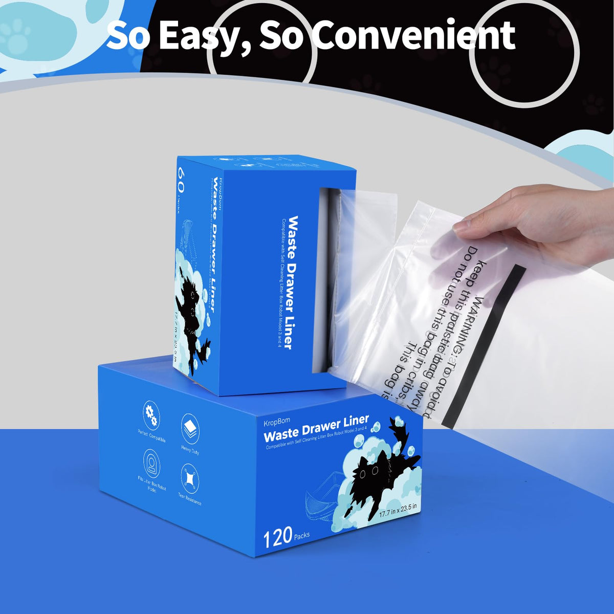 Features:1.Waste Bags Customized for Litter Box Robot Models2. Made of High-quality Material, Thickened and Durable.3. Extra Large Capacity of 9-11 gallons.4. Easy to Use.CUSTOM-FIT Get rid of cat waste easily and quickly with these bags. Compatible with litter box robot models. (litter box robot 2, litter box robot 3, and litter box robot 4)EASY TO INSTAL For the litter box robot 4, simply wrap the edges of the liner over the rim of the waste drawer. for the litter box robot 3, push the rolled edges of the liner into each of the four tabs in the waste drawer.THICKENED MATERIALThe litter line bags are made of extra thick and high-quality material-pure new material and are colorless and odorless. Scratch-resistant, tear-resistant and waterproof. The litter box robot bag is 3 mils thicker than the others(the other is about 1 to 2 mils)SUFFICIENT QUANTITYWe offer 120 trash bags liner that work with litter box robot models self-cleaning cat box, you can replace it according to the number of your cat. However, it is recommended to replace every week for best odor control, so that the bags will last more than half a year.In Package:2 Roll * Cat Robot Litter Waste Bags(total 120pcs)1 *Cat Toy