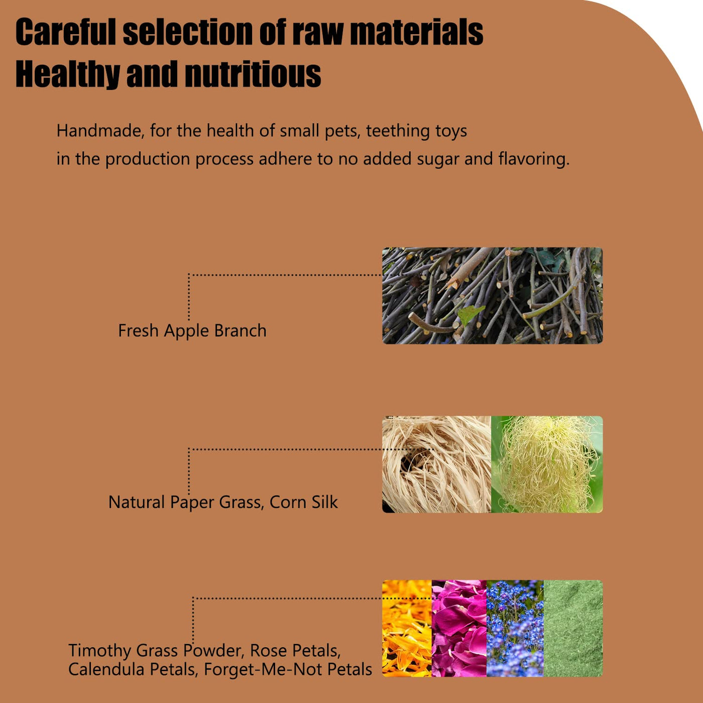 Q: What materials are used in the 13PCS Guinea Pigs Toys set?A: The toys in the 13PCS Guinea Pigs Toys set are made from first-class apple wood, which is dried and processed to ensure a pleasant taste and comfortable use for your pets.