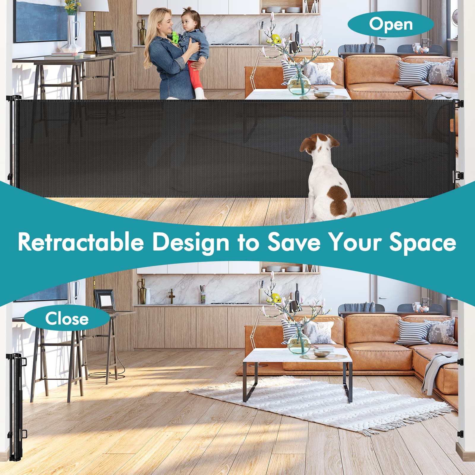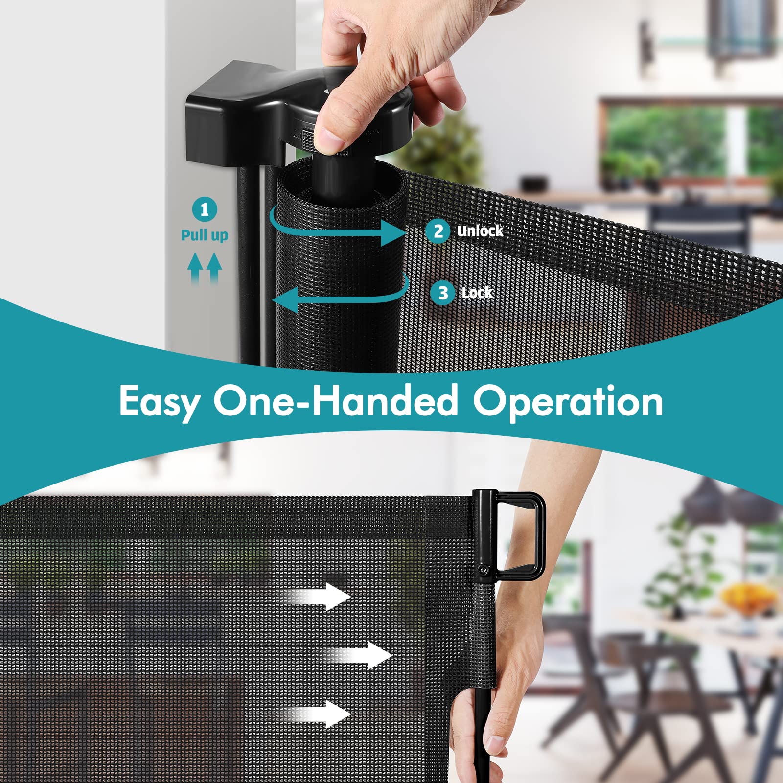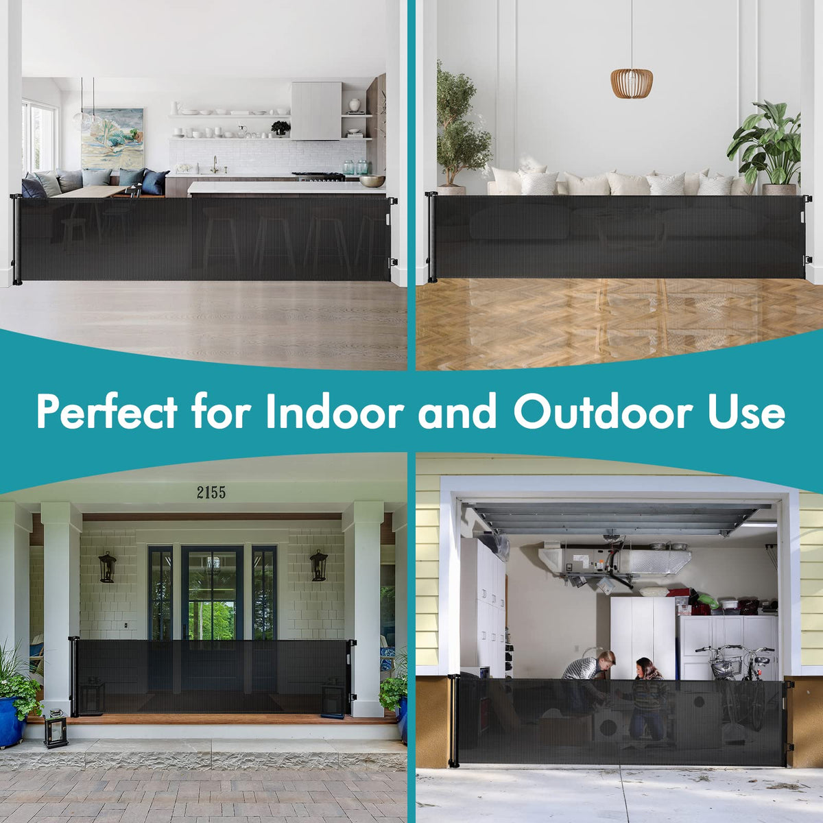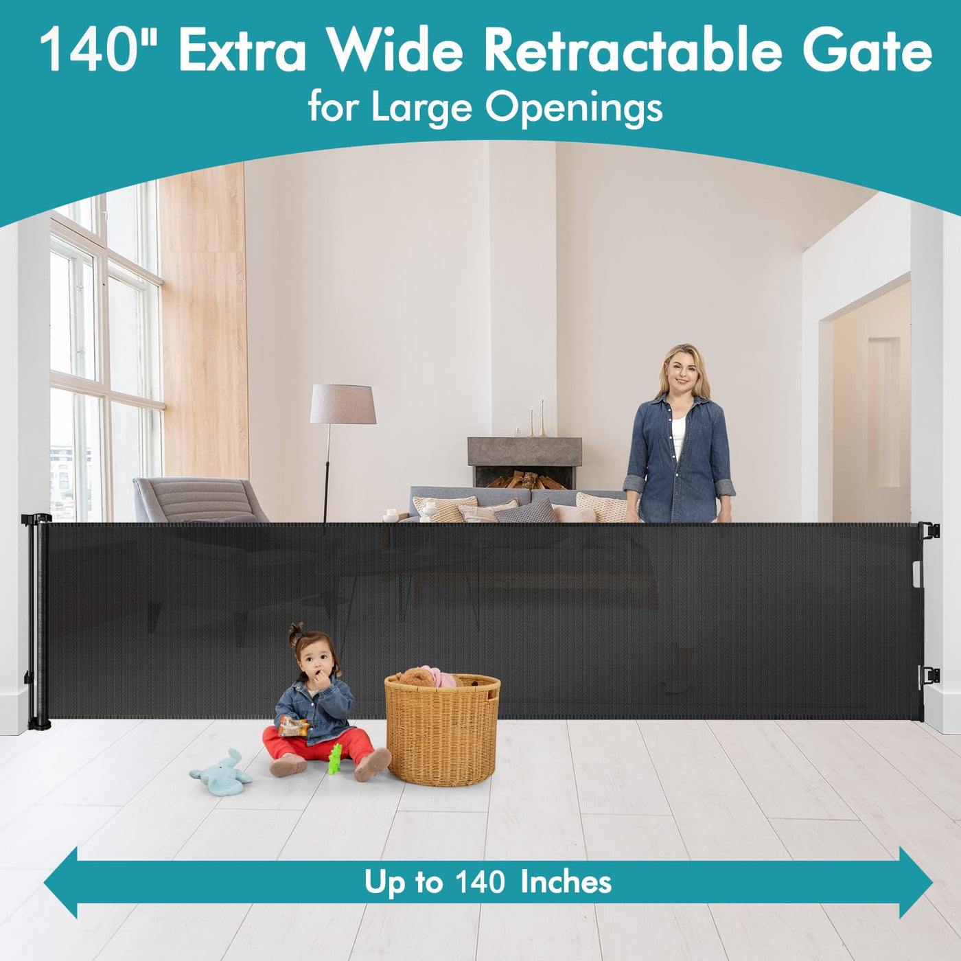 KISKIZ 140 Inch Extra Large Baby Gate and Extra Large Dog Gate Ensure the safety of your babies and furry friends with our 140-inch extra wide retractable mesh gate. Designed to fit openings up to 140 inches wide, this garage gates for dogs and kids provide extensive coverage for indoor and outdoor areas in your home such as kitchen doorways, living rooms, hallways, stairs, decks, porches, and garages. Designed with both babies and pets in mind, our extra wide retractable stair gate provides a secure barrier to prevent access to hazardous areas while allowing easy passage for adults. Its retractable design allows for effortless operation and neat storage when not in use, eliminating the hassle of bulky traditional gates. Installation is simple, no need for professional help or complicated tools. Plus, with safety locking features, you can rest assured that the gate will securely lock, keeping your loved ones safe. Key Features: 1. Dimensions: 33 tall, 140 wide. 2. Adjustable width fits most openings. 3. Retractable design for easy operation and space-saving. 4. High-quality scratch-resistant mesh. 5. Adjustable hardware to fit any baseboard height. 6. Ideal for indoor and outdoor use. 7. Safety lock for simple one-handed operation. 8. No bottom bar - no tripping hazard. 9. Includes full hardware and instructions for easy installation. 10. Meets standard certifications.