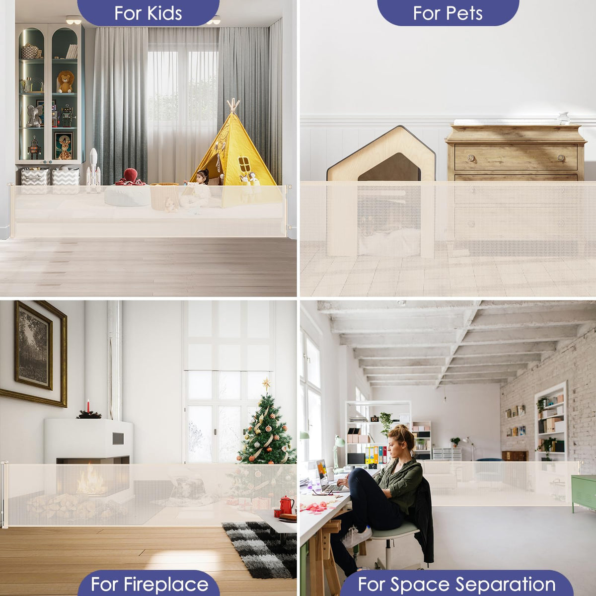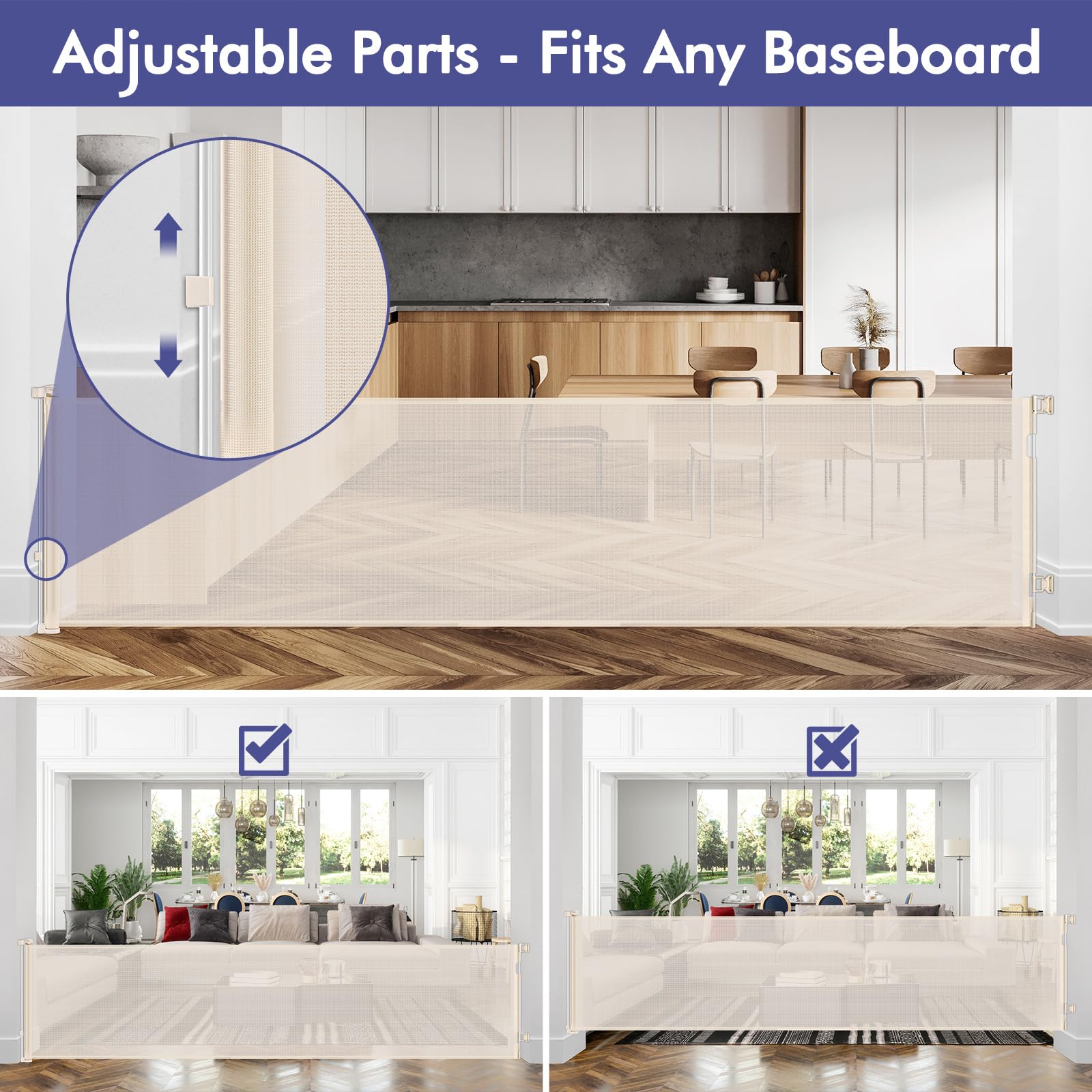 Versatile Extra Wide Retractable Baby Gate and Retractable Dog Gate: KISKIZ retractable baby gates are a versatile home security solution. Whether you want to create a safe baby fence play area for your baby or keep your pets out of certain areas, this extra long pet gate has got you covered. 1. 145 Inch Extra Long Baby Gates for Large Openings: This child safety gate fits large openings up to 145'' wide and 33'' tall. 2. Retractable Safety Gate: You can easily and quickly adjust the retractable baby gate to fit your opening according to your needs. 3. Wide Retractable Gate to Save Space: When not in use or when guests are visiting, the retractable mesh gate retracts to save space. 4. Safety Lock: This retractable dog gate is designed with a safety lock mechanism. Once locked, the large dog gate can be securely closed to prevent babies from accidentally opening it. 5. One-Hand Operation: Adults can easily open and close the extra wide dog gate with 1 hand for easy access. 6. No Trip Hazard: This mesh dog gate retracts and has no bottom rail, giving your home more space and flexibility, and you don't have to worry about tripping over a bulky gate that's always in the way. 7. Fits Any Baseboard: The bottom hardware of the mesh gates for kids or pets can slide up and down to fit any height baseboard, no need to buy extra spacers, making it easier and safer to install. 8. Durable & Scratch-Resistant Soft Mesh: Our child gates for wide openings are made of tough, scratch-resistant material that can withstand pet paws and prevent injuries to children and pets when they accidentally bump into the mesh pet gate. 9. Indoor & Outdoor Retractable Gate: This puppy gate can be used both indoors and outdoors, such as open kitchens, stairs, doorways, decks, garages, porches, etc. 10. Standards Approved: All extra wide child gate is tested to safety standards and meet or exceed ASTM or EM standards.