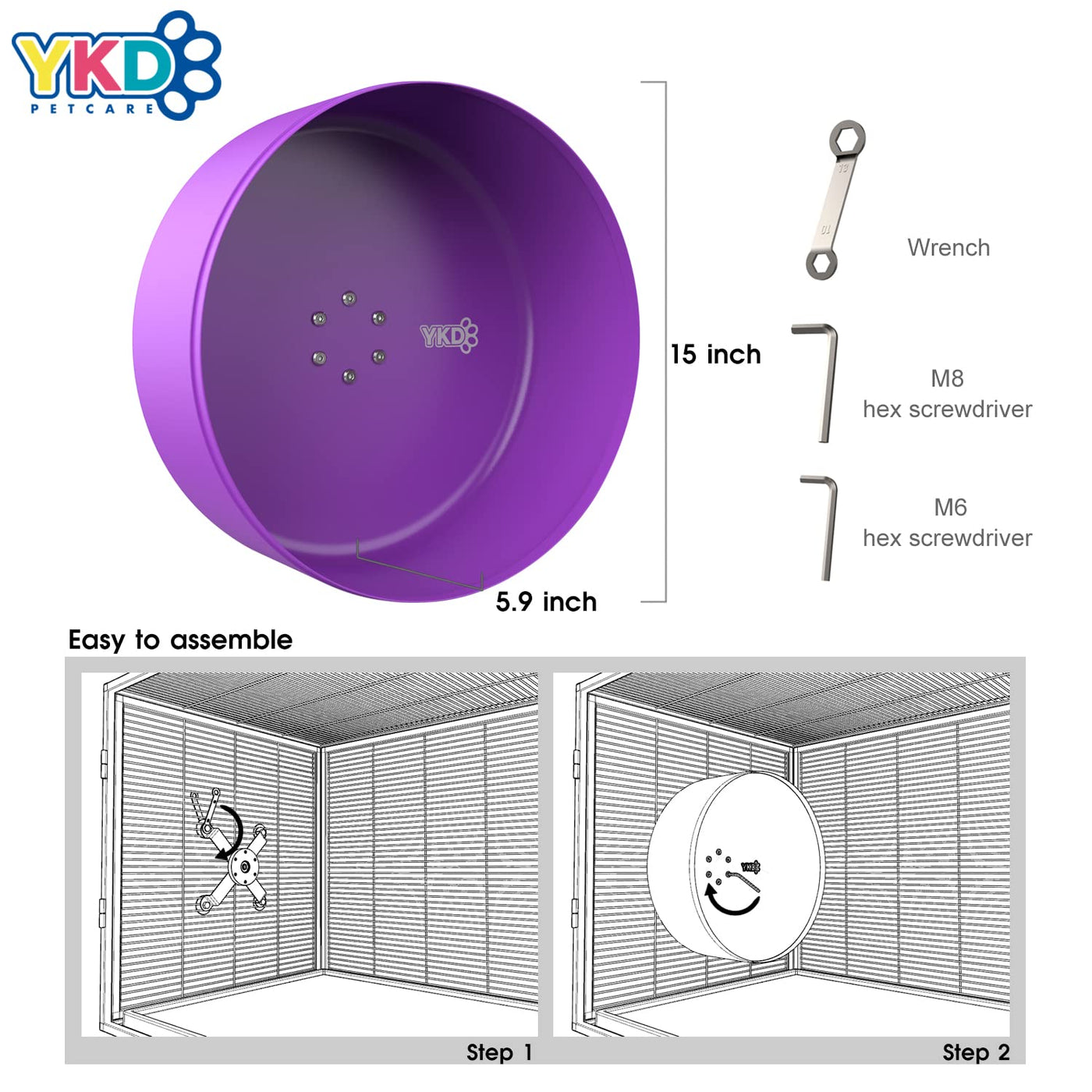 15'' Aluminum Alloy Chinchilla Exercise Wheels. If You Usually Dont Have Time To Accompany Your Little Animal, You Can Give It A Roller Toy Like This, Which Can Be Used As A Play And Fitness Game To Keep Your Little Animal Happy. High-Quality All-Metal Material - The Chinchilla Toy Has A Sturdy Structure And Material, And The Details Are Also Perfect. The Inner Wall Of The Roller Has A Flat Running Surface, And The Chinchilla Can Easily Run On It. Fully Enclosed Design - This Is Very Friendly To Small Pets. The Closed-Back Prevent Your Pet From Getting Stuck, Thereby Significantly Reducing The Risk Of Injury. High Quality Stainless Steel Bearings - Helped To Reduce The Squeaking Sound Due To High Rotating, Also Less The Wave Of Running Drum When Small Animals Running, More Stable & Soundless. Brings Your A Super Silent Sleeping Time, No Matter Your Pet Cage At Other Places Or In Your Room. 15 ''Large Small Animals Running Wheel- Suitable For Chinchillas, Hedgehogs, Devil Squirrels, Syrian Hamster, Large Mouse, Guinea Pigs Wait For Use. Product Specifications: Material: High Quality Aluminum Alloy. Size: Diameter:15 Inch Height:7.9 Inch Products Include: 1 X 15'' Aluminum Alloy Running Wheel 1X Bearing Set 4 X Round Gasket 4 X M8 Nuts 4 X M8 Screws 6 X M6 Screws 1X M6 Hex Screwdriver 1X M8 Hex Screwdrive 1X Glove 2 X Wrench