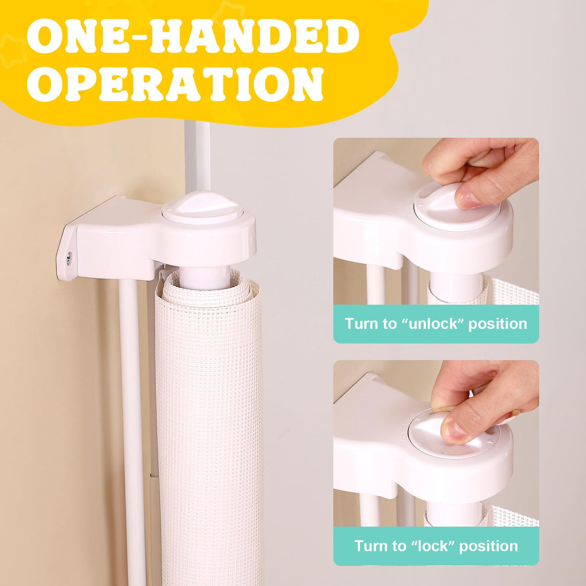 With a maximum width of 150 inches, this extra wide retractable baby gate is suitable for large openings and can meet your needs for a wide range of spaces.The retractable gate design allows you to save floor space when it's not in use, compared to traditional iron doors. With the push of a button, you can even remove it for added convenience.The lower mounting bracket of the retractable dog gate can be adjusted to accommodate the height of the baseboard, allowing it to fit any baseboard. Additionally, the mesh structure is breathable and easy to clean.This versatile gate can be used in various settings, including indoors for houses, doorways, and stairs, as well as outdoors. It's perfect for keeping your children and pets safe, with specific applications for dog gates for stairs, child gates for doorways, puppy gates for the house, and even extra-wide dog gates for the house.