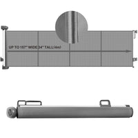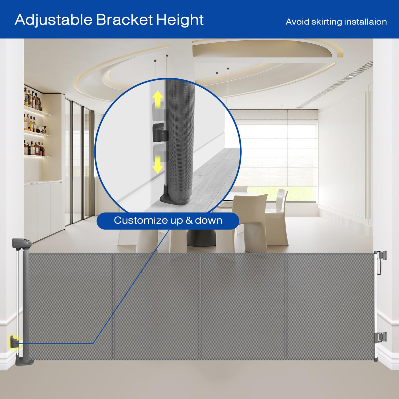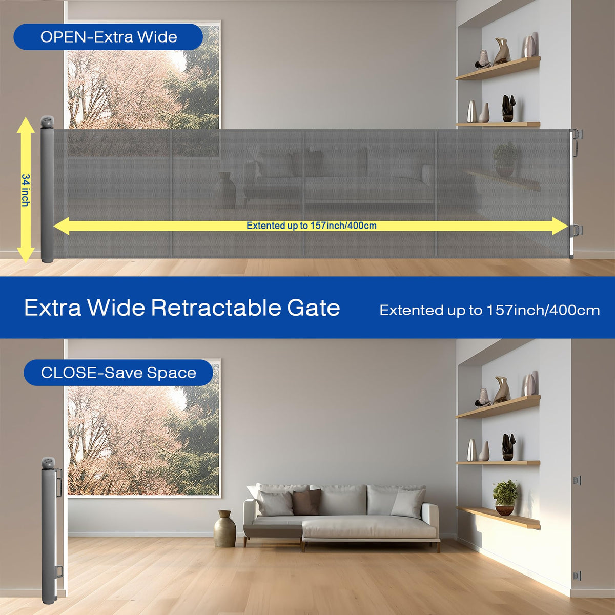 Our retractable baby gate 157 Wide 34 Tall not only offers wide coverage but also features a clever design that saves space. Unlike traditional iron gate rails, our product eliminates bottom rails to ensure clear pathways and eliminate tripping hazards.Easy Installation:Equipped with all necessary components, our baby gate allows for quick and easy installation indoors or outdoors. Whether you need to safeguard doorways, hallways, stairs, or outdoor areas, our retractable dog gate provides reliable safety.Adjustable to Any Baseboard Height: Featuring an adjustable bracket design, our retractable dog gate easily adapts to various baseboard heights without causing wall damage. No matter the height of your baseboards, our baby gate for stairs can be perfectly installed to ensure family safety.Enhanced Stability: Reinforced with fiberglass support bars, our pet gate indoor ensures stability and durability. These support bars provide additional structural support to the soft mesh, reducing sagging or deformation and enhancing effectiveness in preventing crawling.Convenient One-Handed Operation:Designed for one-handed operation, our baby gate with door allows you to easily open and close it, even when carrying your baby or essentials. This convenient design makes household management easier.Safety Dual Lock Design: With an upgraded double locking mechanism, our sliding baby gate allows easy operation for adults while preventing unauthorized access by curious little ones. Its the ideal choice for safety and security throughout your home.Superior Safe Mesh Gate: Crafted from durable and soft PVC mesh, our gates for dogs indoor reduce the risk of accidental injuries while your baby is playing. Plus, it boasts excellent scratch resistance, ensuring durability against pets or outdoor use.Versatile Indoor and Outdoor Use: Our mesh pet gate is suitable for various areas of your home, from kitchens to stairways. Equipped with adjustable lower brackets, it seamlessly adapts to different baseboard heights for a tailored fit. Whether used indoors or outdoors, our gate is suitable for doorways, hallways, stairs, living rooms, kitchens, decks, porches, and more.