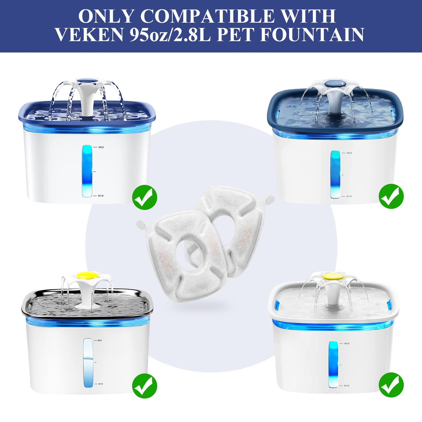 Homefio Cat Fountain Filter Is Only Compatible With Veken 95Oz/2.8L Pet Fountain.&Nbsp;To Help Your Cat Get Into The Habit Of Drinking Water, We Need To Make Sure The Water They Drink Is Enough Fresh And Pure.So We Need To Replace The Cat Fountain Filter Regularly.How Does The Carbon Filter Work For?Cat Filter For Water Fountain Is Made Of Non-Woven Fabric, Ion Exchange Resin And Activated Carbon. Every Part Of The Material Builds A Triple-Filtration System.?Catch Hair, Debris, And Residue;?Filter Heavy Mental, Ions, And Chlorine;?Remove Odor And Absorb Soluble Impurities.When You Replace The Filter Every 2-4 Weeks You Will See The Impurities On The Fabric Layer'S Surface. So Regularly Replacing The Filter Can Maintain A Better Effect.Faqq: Is The Filter Compatible With Veken 84Oz/2.5La: No, It'S Only Compatible With Their 95Oz/2.8L Pet Fountainq: How Long Should I Replace The Filter And Foam?A: 2-4 Weeks. You'D Better Replace It According To Your Pet'S Drinking Frequency And The Number Of Pets Using The Fountain.