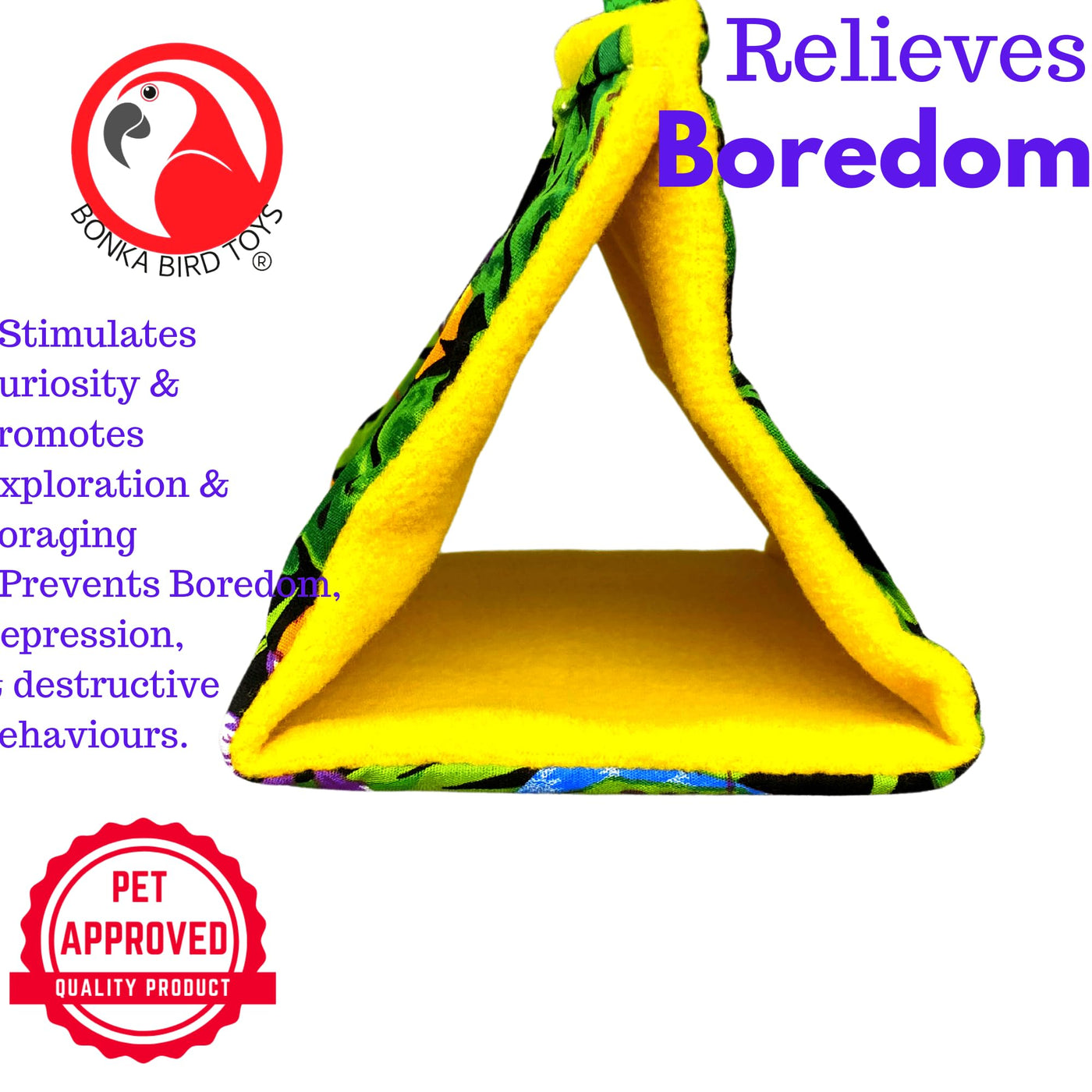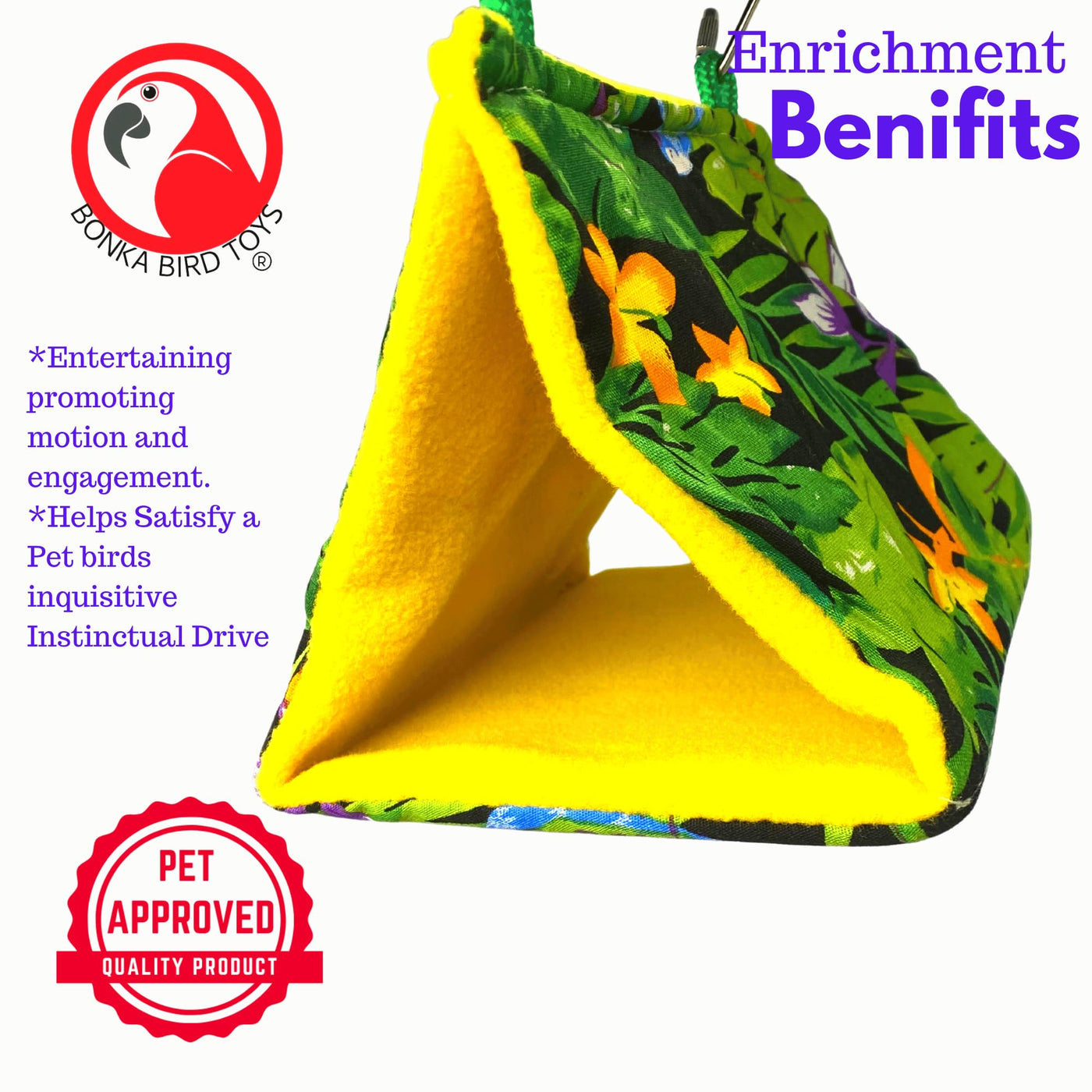 The 1689 Small Bonka Happy Hut From Bonka Bird Toys Is A Soft And Colorful Hanging Hut For Your Small Sized Pet Bird. This Attractive Hanging Hut Looks Wonderful With Its Jungle Print And Feels Great With Its Colorful Soft Fabric. At The Top Of The Bird Hut Are (2) Quick Link Connectors For Fast And Easy Hanging In The Cage. Wrapping Around The Connectors Are (2) Soft Colorful Ropes That Stitch Into The Top Of The Hut. The Outside Of The Hut Has A Jungle Leaf Print With Many Different Sizes And Colors Of Jungle Foliage. The Inside Of The Hut Has A Soft Felt Like Fabric Thats Super Cuddly For Pet Birds. The Bottom Of The Hut Has Been Reinforced And Will Hang Flat Giving Your Pet A Comfy Place To Sit And Relax. The Hut Also Lets You Place Your Pets Favorite Shredding, Fabric And Any Other Kind Of Material Inside. Perfect For Adding A Safe Comfortable Hanging Perch To Any Small Cage! The 1689 Small Bonka Happy Hut Is 100% Bird Safeand Weighs And Measures Approximately: Height:(5.75) Inches Or (5 3/4) Inches Width:(4.75) Inches Or (4 3/4) Inches Weight:Under (3) Ounces * Cuddly & Colorful Bird Safe Hanging Hut. * Great Jungle Print. * Soft Interior Fabric. * 100% Bird Safe.