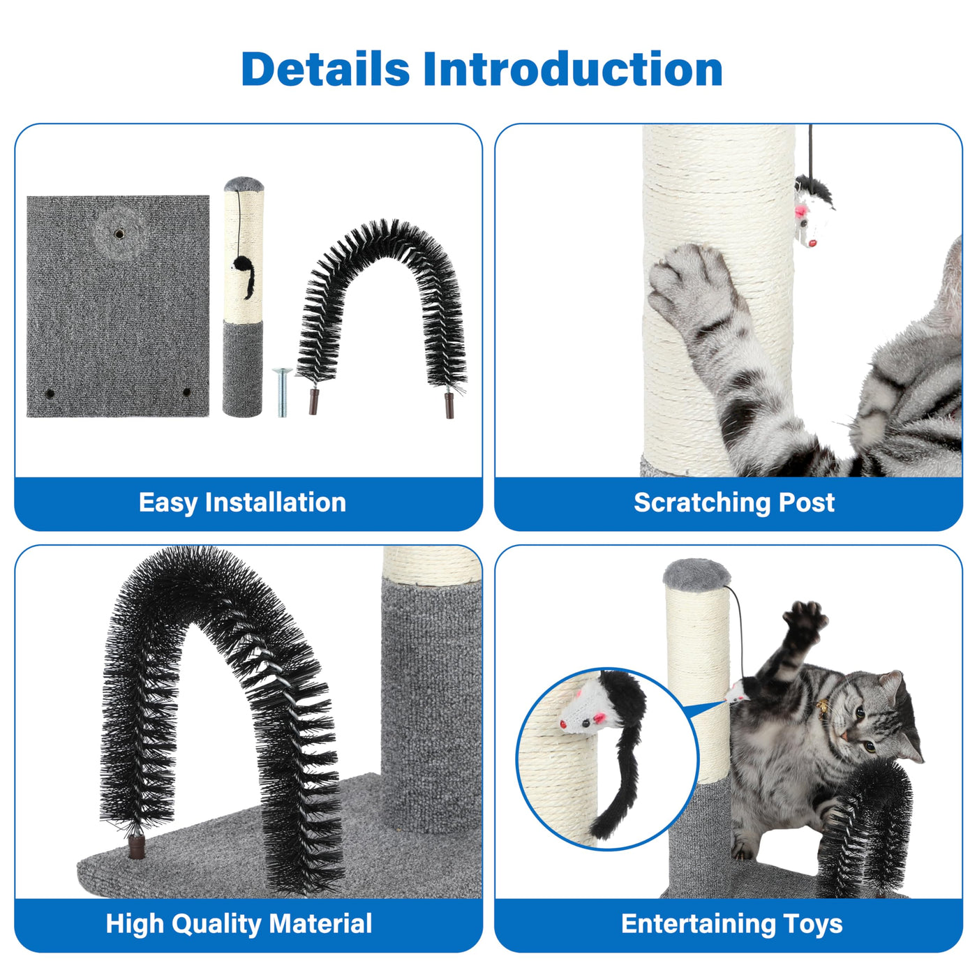 Enhance your cats well-being and entertainment with our stylish and sturdy Cat Tree Tower, offering cozy retreats, natural sisal scratching posts, replaceable toys, and an all-in-one haven for scratching, climbing, grooming, and playing