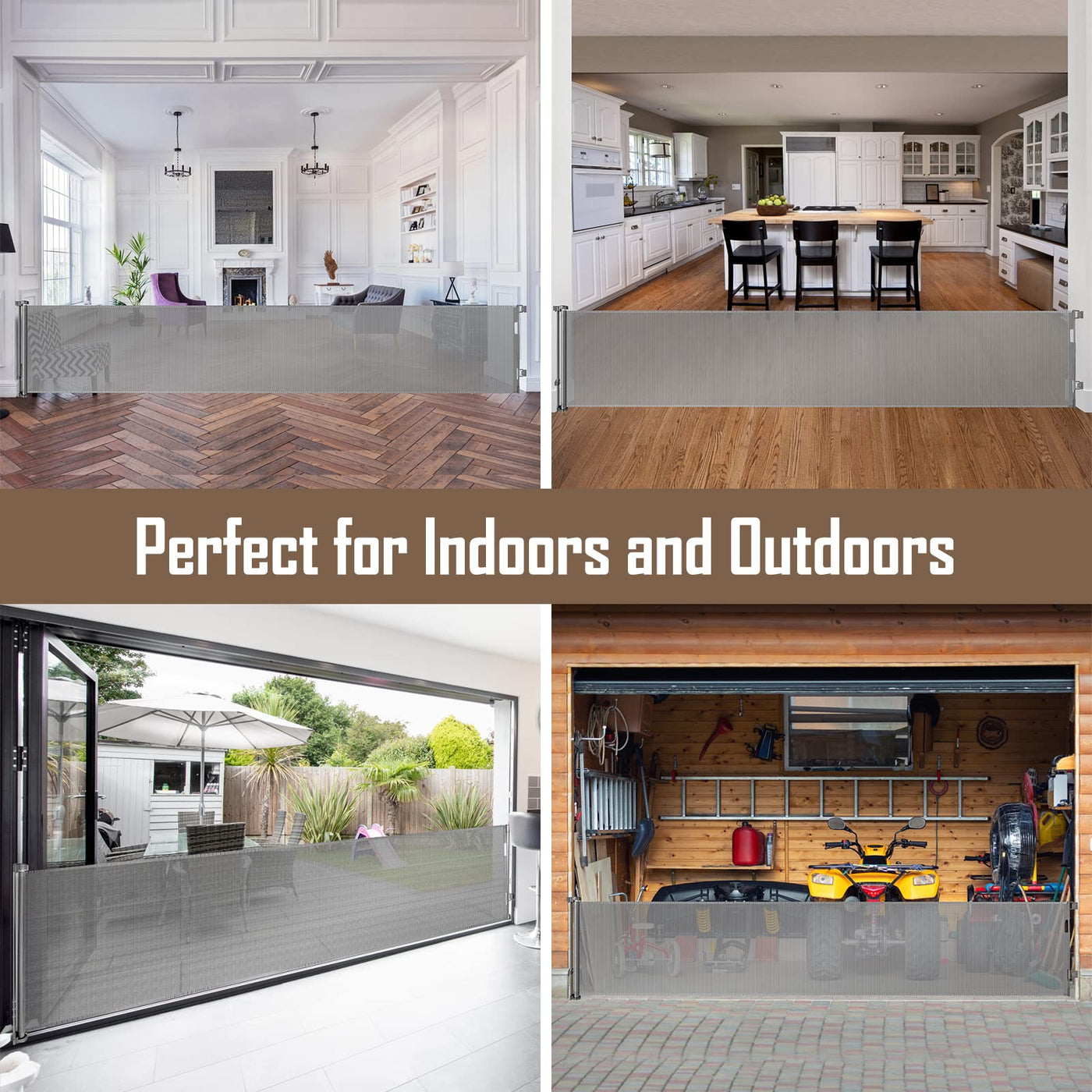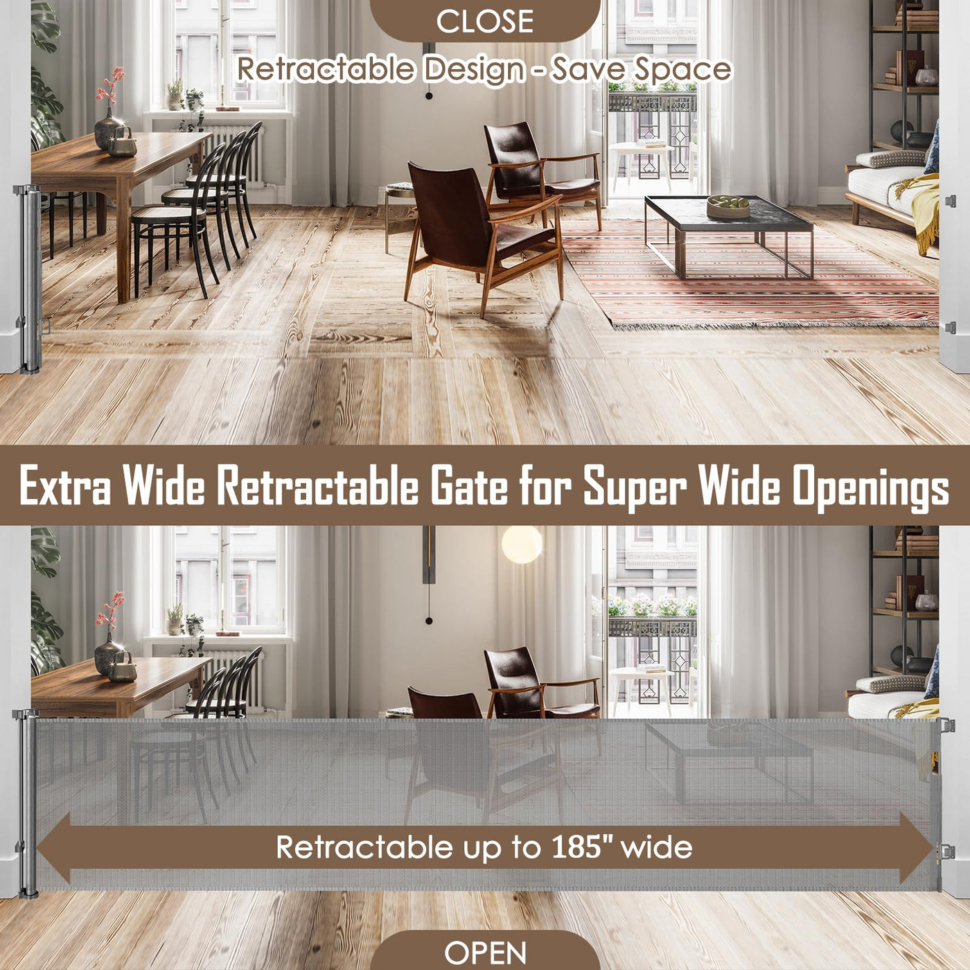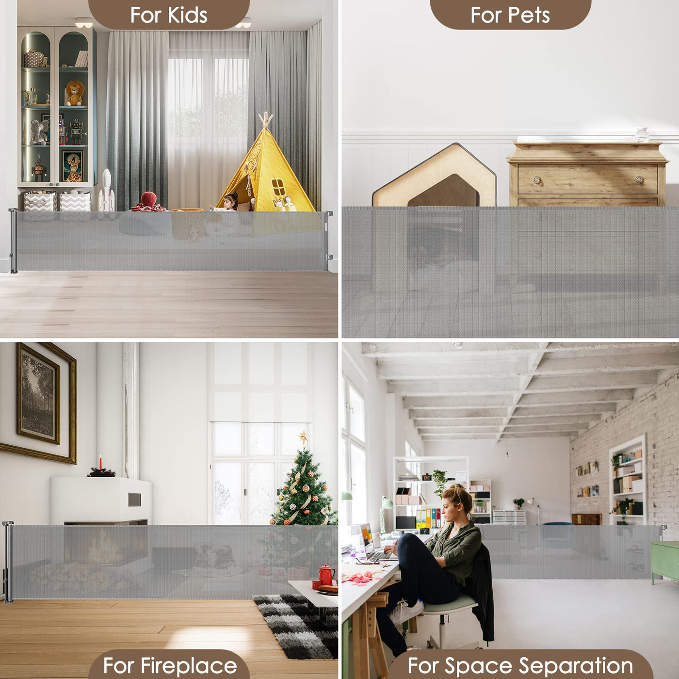 KISKIZ 185'' Extra Large Baby Gate and Extra Wide Dog Gate The KISKIZ extra wide retractable baby gate functions as a child safety gate, pet barrier, semi-enclosed play area, fireplace guard, and room divider. It offers flexible solutions for homes with open floor plans or wide spaces, allowing you to effectively manage and divide areas for both babies and pets. 1. Suitable for Babies & Pets This baby fence for living room is ideal for homes with both babies and pets, serving as a reliable barrier or room divider. 2. Extra Wide Coverage Extends up to 185 inches wide, making it perfect for spacious homes with expansive openings. 3. Adjustable Width for Versatile Openings Features an adjustable width, making it suitable for a variety of opening sizes. 4. Fully Retractable The retractable dog fence fully retracts when not in use, saving space and offering convenience. 5. Adaptable for Various Locations Ideal for both indoor and outdoor openings, such as open kitchens, hallways, doorways, decks, garages, and more. 6. High-Quality Mesh Soft yet durable mesh fabric prevents injuries and scratches during playtime. 7. Safety Lock Mechanism Equipped with a secure safety lock that keeps the extra wide pet gate securely closed to prevent accidental openings. 8. Easy One-Handed Operation Easily open and close the extra long pet gate with 1 hand for quick and convenient access. 9. No Trip Hazard Designed with no bottom bar, ensuring smooth and safe passage. 10. Fits Any Baseboard Lower brackets adjust up or down to fit any baseboard height without causing damage. 11. Easy Installation Includes all necessary mounting hardware for simple and secure installation. 12. Certified Safe Meets or exceeds ASTM and EN safety standards, ensuring reliability and safety for your family.