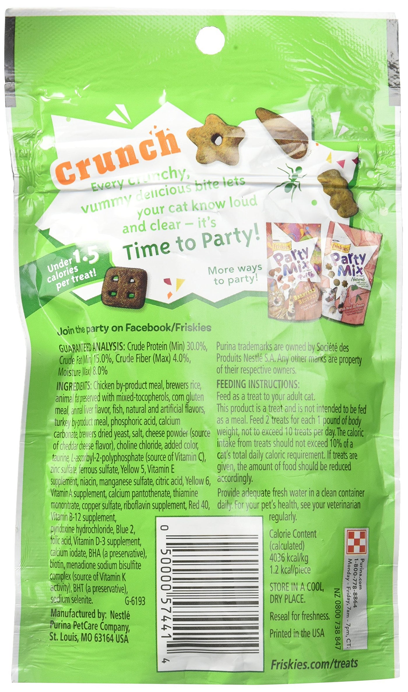 Friskies Beachside Crunch Party Mix Cat Treats are made up with a variety of flavor-coated shapes, each with its own unique crunch. Made with so many enticing aromas, delicious flavors, tantalizing textures and colors for your cat to explore, it will be a party every day. A blend of shrimp, crab, and tuna flavors.