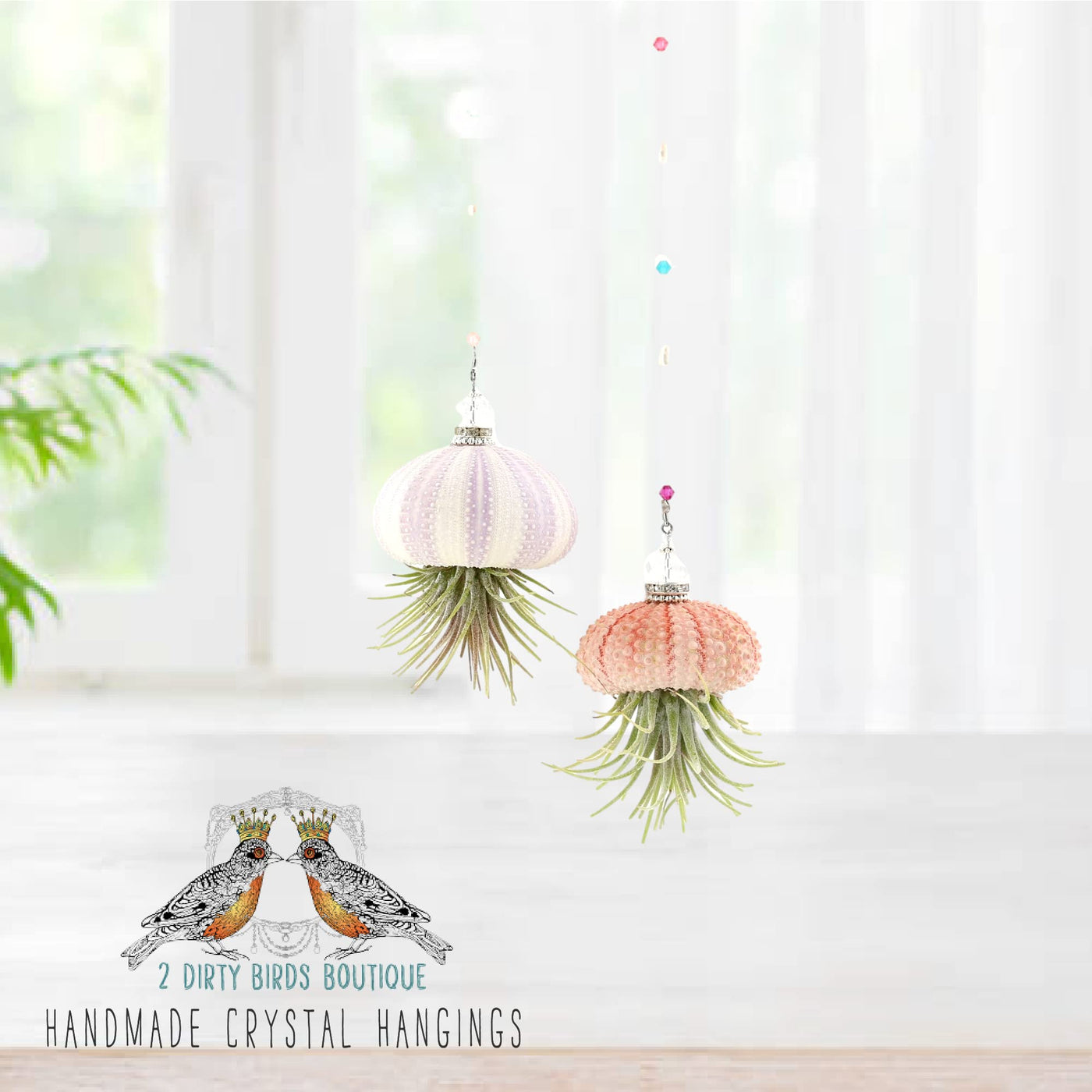 Features And Benefits: Whats Included: (2 Hanging Jellyfish Airplants) Average Hanging Length Is 13-15 Inches, Urchin Shell Varies 2-3 Inches, Live Jellyfish Hanging Air Succulent Plants, Strung With Swarovski Crystals, And Freshwater Pearls. Your Live Air Plant Will Come Carefully Wrapped With Plant Care Instructions And A Special Handwritten Note From Our Makers. Easy Care: With The Proper Amount Of Water And Light Our Plants Are Easy To Care For And Provide Low Maintenance. We Include Easy To Follow Instructions For Every Order. Our One-Of-A-Kind Hanging Air Plant Requires Minimum Effort, Just Mist A Few Times A Week! Great For Any Bathroom, Desk, Or Indoor Terrarium. Our Hanging Succulent Makes For A Great Introductory Plant, And Brings Life To Any Space Thoughtful & Affordable Gift: Everyone Knows Someone Who Loves Sprucing Up Their Living Space, Give The Gift Of Elegance And Fun, With Our Unique And Fun Hanging Jellyfish Air Plants. Applications Use: For Boho D Cor, Home D Cor, Easy To Care For House Plant, Can Be Hung Indoor Or Outdoor, Great Terrarium Ornament Gift, Unique Cubicle D Cor Brand Integrity: Our Company (2 Dirty Birds Boutique) - We Hand Craft Our Pieces With Beautiful Objects That Pay Tribute To The Natural World. Made From Our Hearts And Hands For You To Treasure. Product Description: Add Some Living Sparkle To Your Decor With Our Super Cute, Set Of 2 Handmade Sea Urchin Hanging Jellyfish Air Plants 2 Dirty Birds Boutique Is Proud To Deliver Our All New Bejeweled Hanging Jellyfish Air Plant: The Perfect Accessory To Add Life To Your Home, Office, Spa, Or Sunroom. Featuring Swarovski Crystal, Sea Urchin Shells And Freshwater Pearls, Our Jellyfish Air Plant Offers A Unique Bohemian Style That You Can'T Find Anywhere Else.