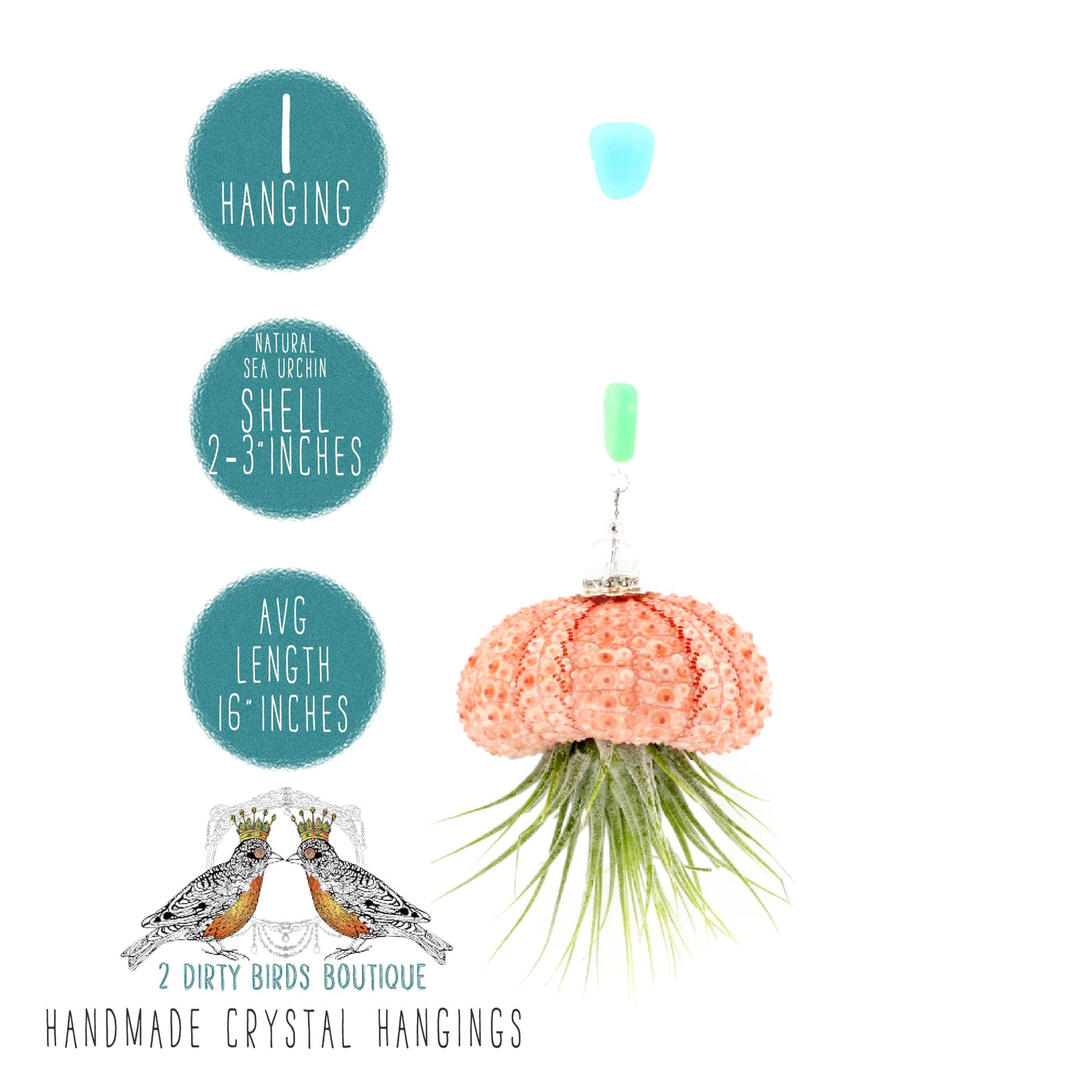 Features And Benefits:Whats Included: (1) 16- 20 Inch Beaded Line Length, Live Jellyfish Hanging Air Succulent Plants, Lovely Peach/Pink Sea Urchin Shell. Swarovski Crystals, Freshwater Pearls & Sea Glass Beads. Your Air Plant Will Come Carefully Wrapped With Plant Care Instructions And With A Special Handwritten Note From Our Makers! Easy Care: With The Proper Amount Of Water And Light Our Plants Are Easy To Care For And Provide Low Maintenance. We Include Easy To Follow Instructions For Every Order. Our One-Of-A-Kind Hanging Air Plant Requires Minimum Effort, Just Mist A Few Times A Week! Great For Any Bathroom, Desk, Or Indoor Terrarium. Our Succulent Makes For A Great Introductory Plant, And Brings Life To Any Space Thoughtful & Affordable Gift: Everyone Knows Someone Who Loves Sprucing Up Their Living Space, Give The Gift Of Elegance And Fun, With Our Unique And Fun Hanging Jellyfish Air Plants! Applications Use: For Boho D Cor, Home D Cor, Easy To Care For House Plant, Can Be Hung Indoor Or Outdoor, Great Terrarium Ornament Gift, Unique Cubicle D Cor Brand Integrity: Our Company (2 Dirty Birds Boutique) - We Hand Craft Our Pieces With Beautiful Objects That Pay Tribute To The Natural World. Made From Our Hearts And Hands For You To Treasure, Bringing A Bit Of Joy And Sparkle To Just About Any Space. Product Description: Add Some Living ''Bling'' To Your Decor With Our Super Cute, Set Of 1 Handmade Hanging ''Jellyfish'' Air Plant 2 Dirty Birds Boutique Is Proud To Deliver Our All New Bejeweled Hanging Jellyfish Air Plant: The Perfect Accessory To Add Life To Your Home, Office, Spa, Or Sunroom. Featuring Swarovski Crystal, Sea Glass Beads, And Freshwater Pearls, Our Jellyfish Air Plant Offers A Unique Bohemian Style That You Can'T Find Anywhere Else.