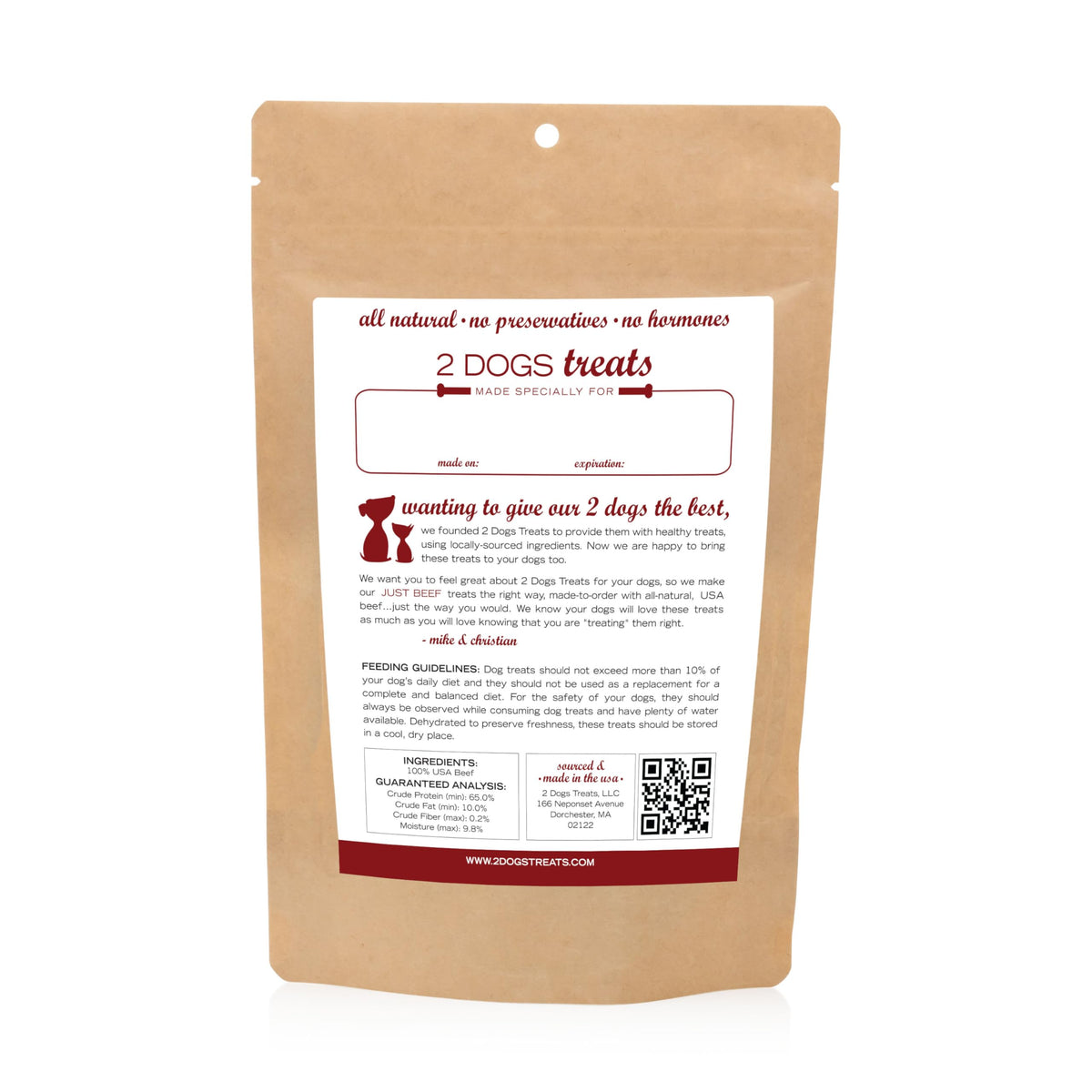 We founded 2 Dogs Treats with a focus on the nutrition, health, and safety of our two dogs, Riley and JLo. After learning about the dangers of treats made overseas with imported ingredients we decided to take matters into our own hands and research the best methods for providing our pups with a reward we could feel good about. We wanted to provide the same peace of mind to other families concerned with what their four-legged family members were eating with a line of treats that: - are 100% sourced & made in the USA - use only human-grade ingredients - are made from only 1 ingredient (no preservatives, fillers or hormones) - are grain-free and gluten-free so are ideal for the growing number of dogs with food sensitivities and - most importantly are healthy and taste great! Made with 100% human-grade USDA beef, these jerky strips are produced in small batches and are filler, preservative, and hormone free. Our Just Beef treats are slowly dehydrated and savory just the way dogs love and are safe for owners to handle.