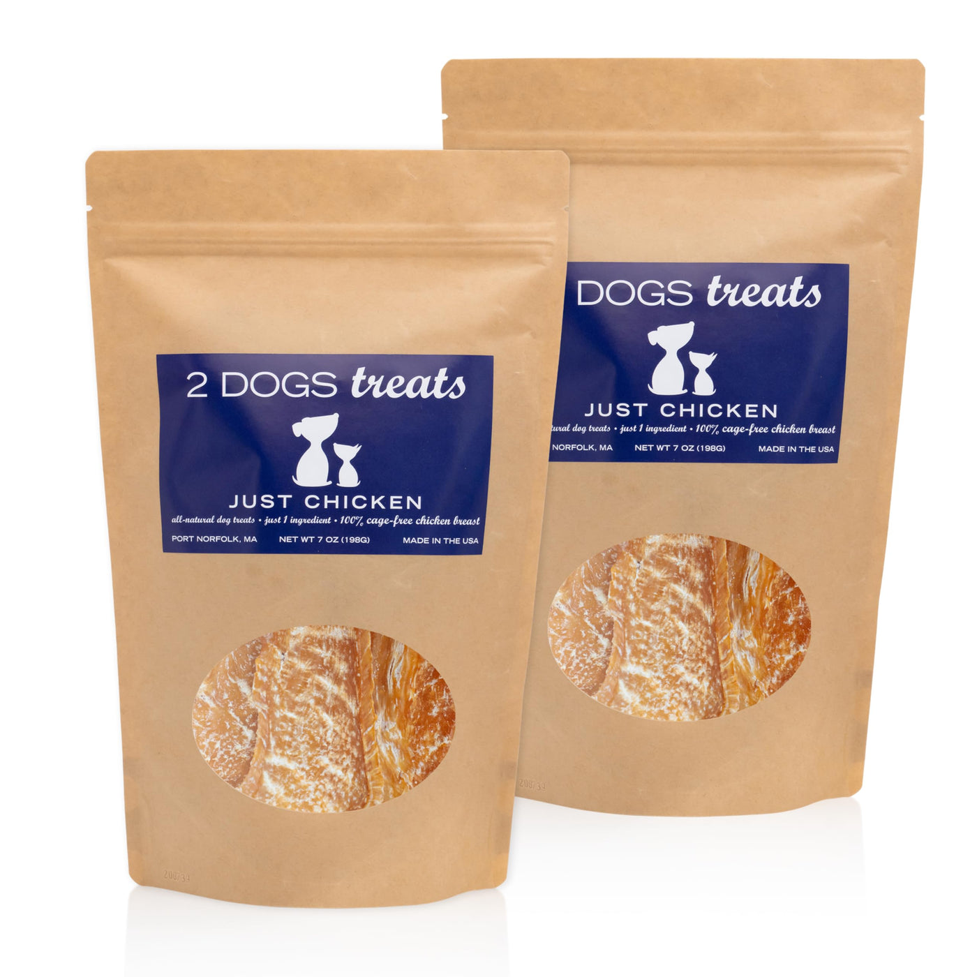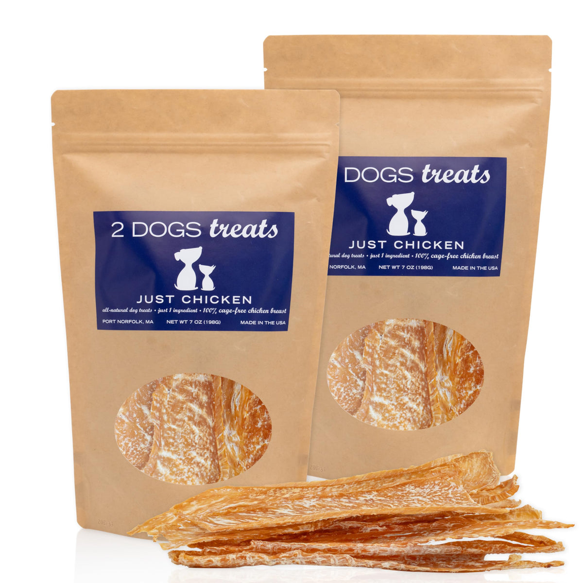 We founded 2 Dogs Treats with a focus on the nutrition, health, and safety of our two dogs, Riley and JLo. After learning about the dangers of treats made overseas with imported ingredients we decided to take matters into our own hands and research the best methods for providing our pups with a reward we could feel good about. We wanted to provide the same peace of mind to other families concerned with what their four-legged family members were eating with a line of treats that: - are 100% sourced & made in the USA - use only human-grade ingredients - are made from only 1 ingredient (no preservatives, fillers or hormones) - are grain-free and gluten-free so are ideal for the growing number of dogs with food sensitivities and - most importantly are healthy and taste great! Made with 100% human-grade USDA cage-free chicken breast, these jerky strips are produced in small batches and are filler, preservative, and hormone free. Our Just Chicken treats are slowly dehydrated and gently baked to a golden savory crunch that dogs love, and are safe for owners to handle.