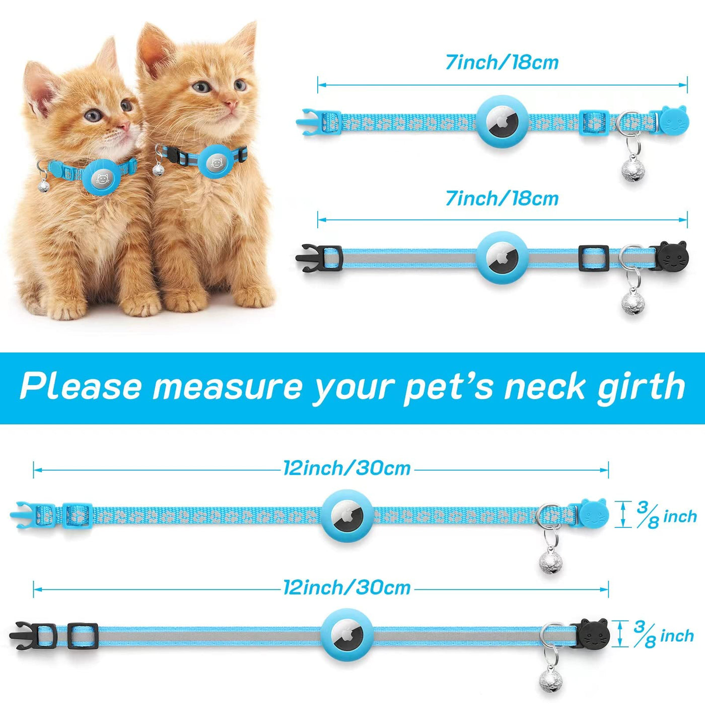 Q: Is the collar compatible with Apple AirTag?A: Yes, this cat collar is designed specifically for Apple AirTag. It comes with an elastic silicone case that securely holds the AirTag to prevent it from falling off or dangling.