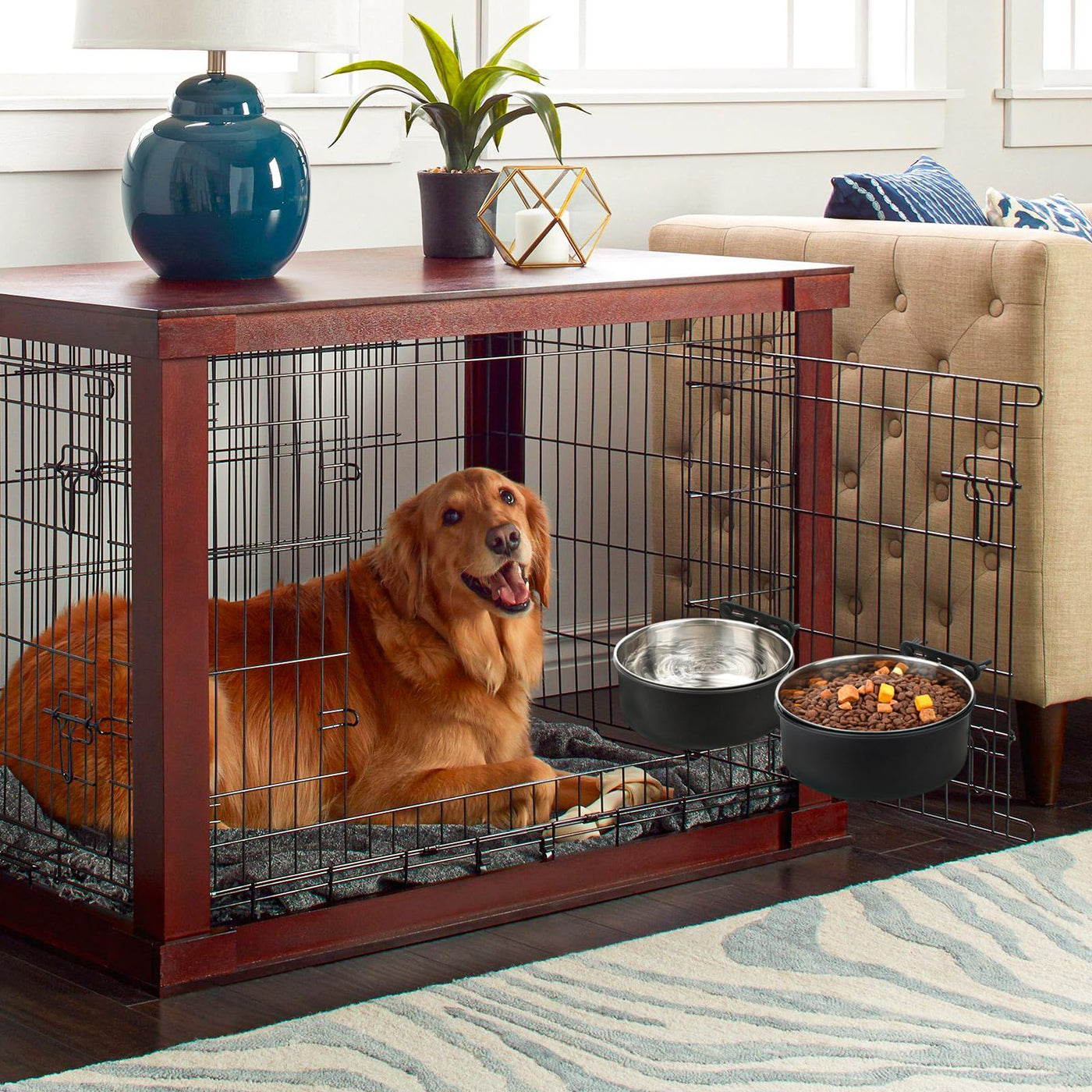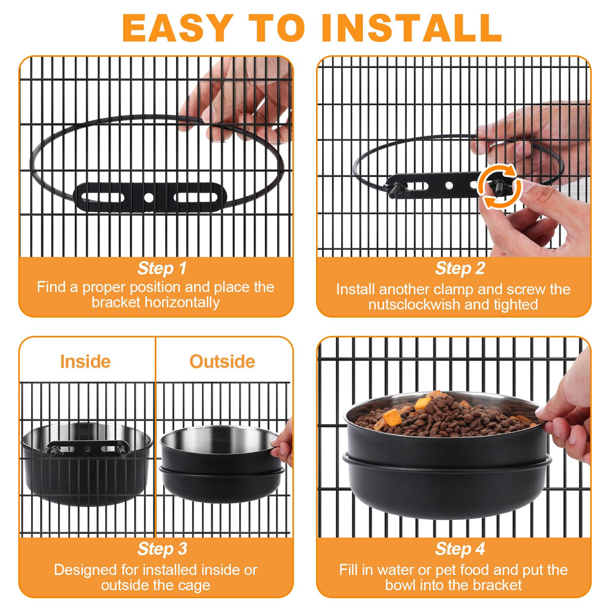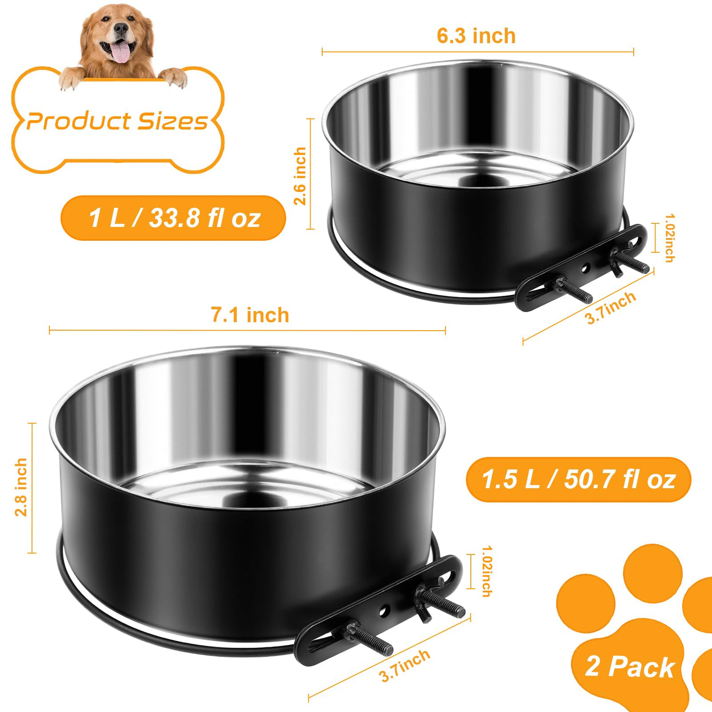 2 Pack No Spill Dog Crate Bowls, Black Stainless Steel Mountable Crate Bowls For Kennel Cage, Cat Puppy Bunny Birds (50Oz+33Oz)