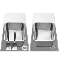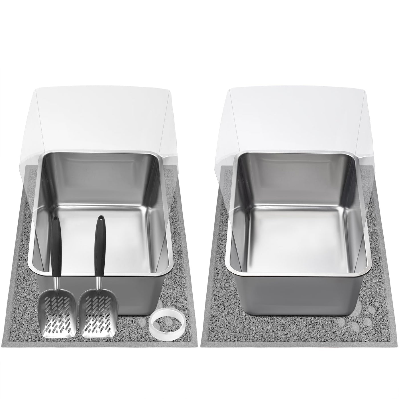 Product Details 1. Package Including: 2 Pcs Extra Large Stainless Steel Litter Box, 2 Cat Litter Mats, 2 Litter Scoopers, 8 Plastic Shields, 1 Nano Glue 2. Target Species: Kitten, Kitty, Small, Medium And Large Size Cats 3. How To Install: Cut The Nano Glue With A Proper Size And Take It On The Pvc Splash Shields, Then Stick It On The Stainless Steel Litter Box