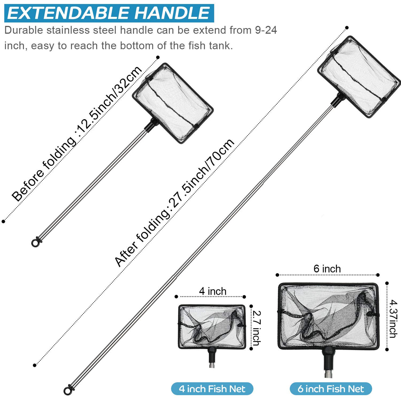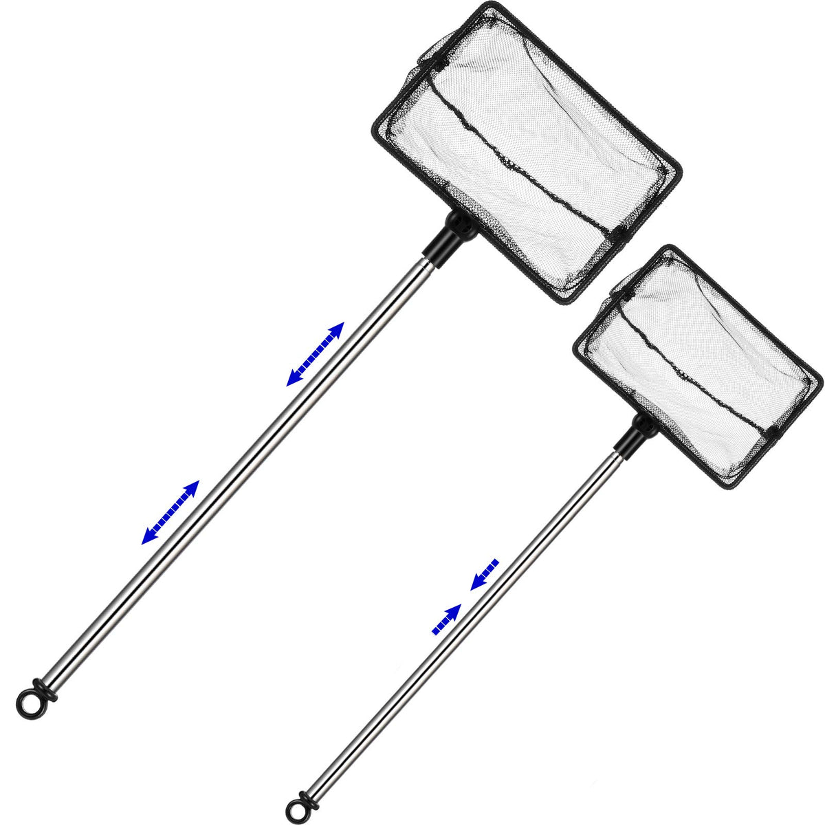 Mesh fish tank net aquarium fish net 4 inch and 6 inch stainless steel fish net with extendable 12.5-27.5 Inch long handle fish catch nets fish tank aquarium accessories Reliable material for convenient handle design: The telescopic workmanship allows you to reach the bottom of the tank while barely getting hands wet. The nylon mesh will prevent injury to the scales or tail of your beloved fish. 2 Sizes of fish net: The handle is made of rust prevent 304 stainless steel material, suitable for daily aquarium maintenance. 2 Sizes fish nets are available, easy for you to replace or exchange. Practical tool: Fine mesh net is suitable for safely transferring delicate fish and skimming small debris from the water. An essential tool for aquariums and pools. Specifications: Material: stainless steel and nylon Color: as shown in the figure Size: 4 Inch net : approx. 4 x 3 inches (W x H), with a pocket depth of 2.5 inch 6 Inch net: approx. 6 x 4.5 inches (W x H) with a pocket depth of 4 inches Quantity: 2 pieces Package contents: 1 x 4 Inch fish tank net 1 x 6 Inch fish tank net Warm notice: After use, dry the handle in time and place it in a cool and ventilated place, which is beneficial to prolong the service life. Dimensions are measured manually and may be subject to errors.