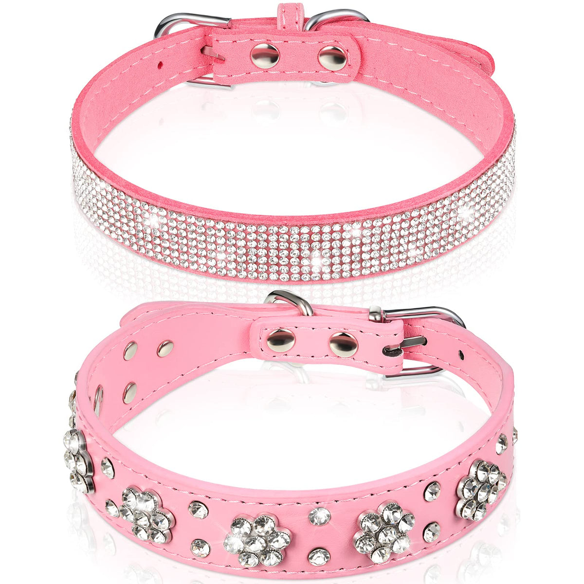 2 Pieces Pu Leather Dog Collar Pink Rhinestone Pet Collar Flower Pattern Studded Dog Collar Adjustable Bling Puppy Collar Pu Leather Crystal Pet Collars For Dogs (M 12-15 Inch)