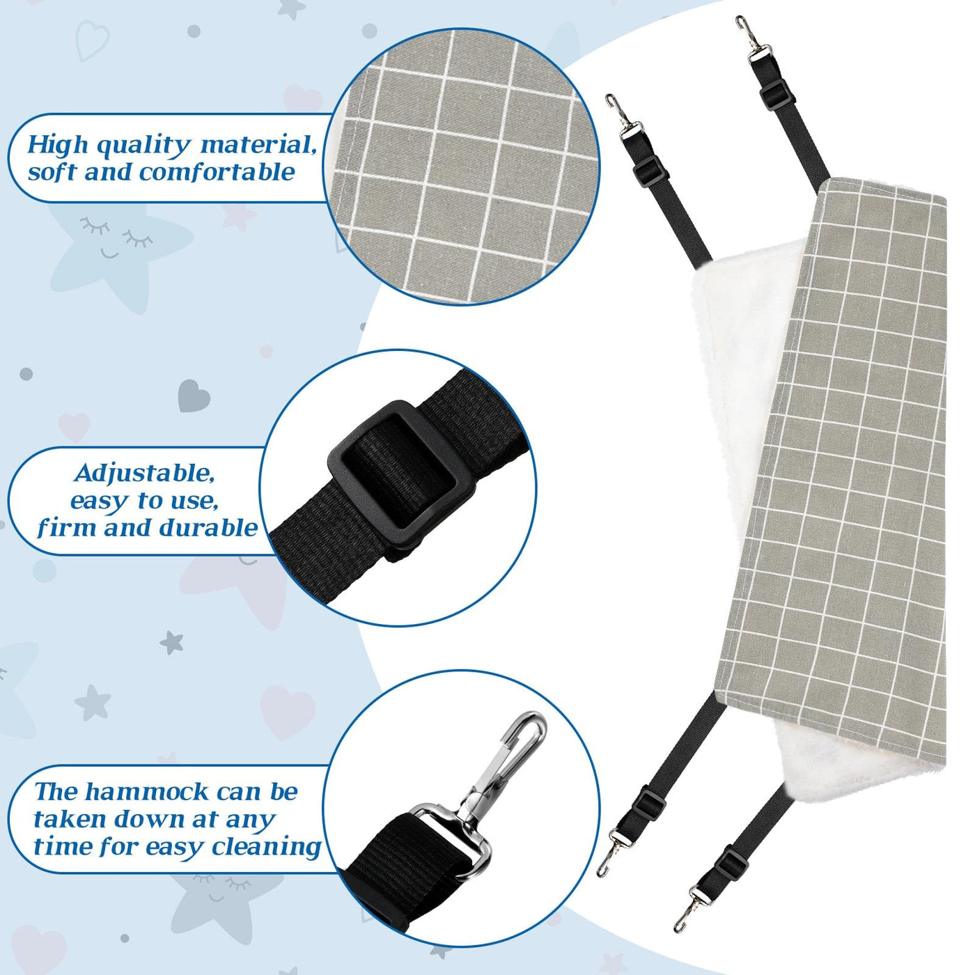 Features: Package contents: You will receive 2 pieces of cat hanging hammocks with different patterns, cute and vivid patterns will win your pet's love, providing a safe and comfortable resting place for your lovely pets, and a sense of warmth and comfort at the same time. Reliable materials: Flax and fleece materials are applied to keep warm and ventilate, owns soft and comfortable hand feeling. It provides a comfortable place for your lovely pets to relax, play and sleep. Double sided design: The two sides of the pet cage hammock can be applied according to the season, you can choose one side to use according to your needs, which is convenient for cleaning. Equipped with metal hooks, please wash with a laundry bag to protect your washing machine. Convenient suspension design: The metal hooks are applied to fix to the corners of crates or cages, or additional adjustable straps are applied to hang on most chairs. This hammock can be installed under the chair or in the cage, which can help save space and also cats naturally like to hide in hidden places. Wide applications: This reversible cat hanging hammock is suitable for pet hospital, family and tourism use, very suitable for rabbits, kittens, hamsters, small dogs, ferrets, chinchillas, pet mice and other small animals, bringing much fun for your small animals. Specifications: Material: flax and fleece Color: as shown in the pictures Size: as shown in the pictures Package includes: 2 x Reversible cat hanging hammocks Warm notes: 1. Please allow a little error on the size due to manual measurement. 2. The color might exist slight difference due to different displays.