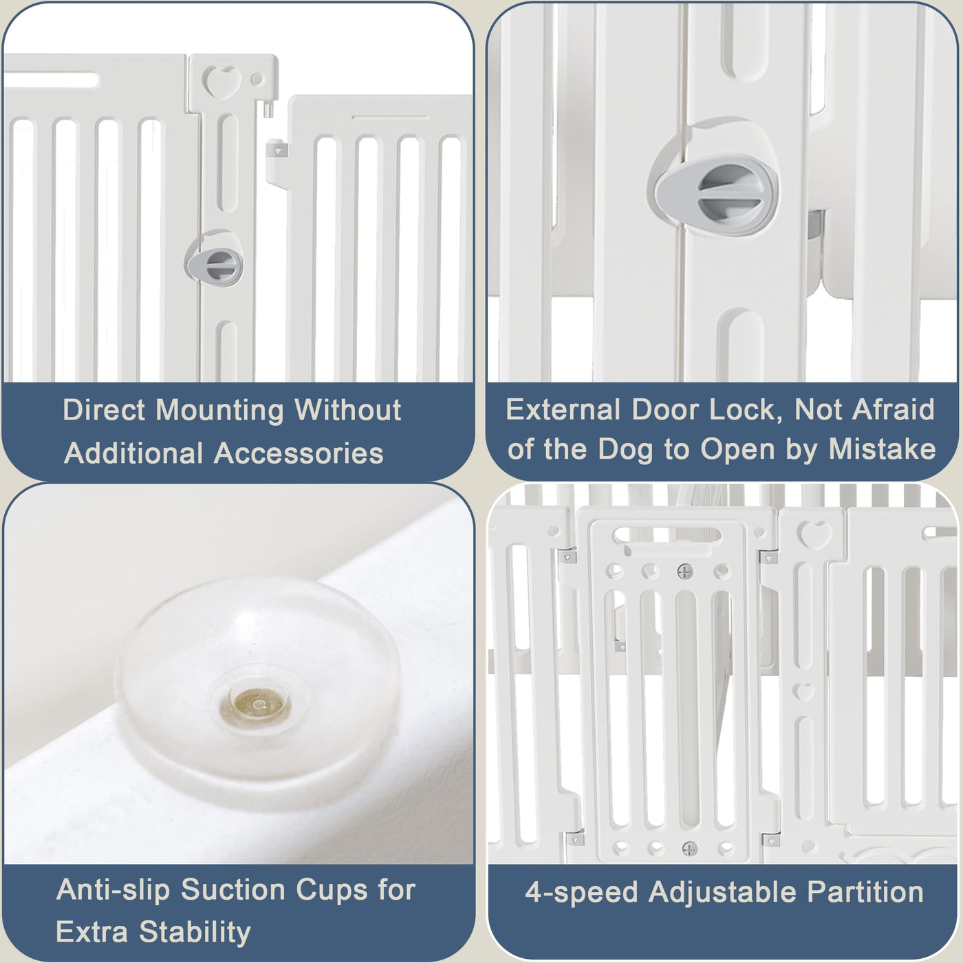 The Pet Playpen Is Suitable For Large Or Small Dogs. The Product Is Not Afraid Of Chewing And Durable, The Surface Is Soft Touch To Protect Your Dog'S Skin. Equipped With An External Door Lock To Prevent Accidental Opening, Safe And Secure. With Non-Slip Suction Cups At The Bottom, It Can Be Firmly Adsorbed On The Ground. It Is Also Self-Assembling And Can Be Adjusted In Shape And Size To Suit Your Room Layout. The Large Enclosure Can Also Be Separated Into Two Activity Areas, Making It Ideal For Multi-Dog Households.