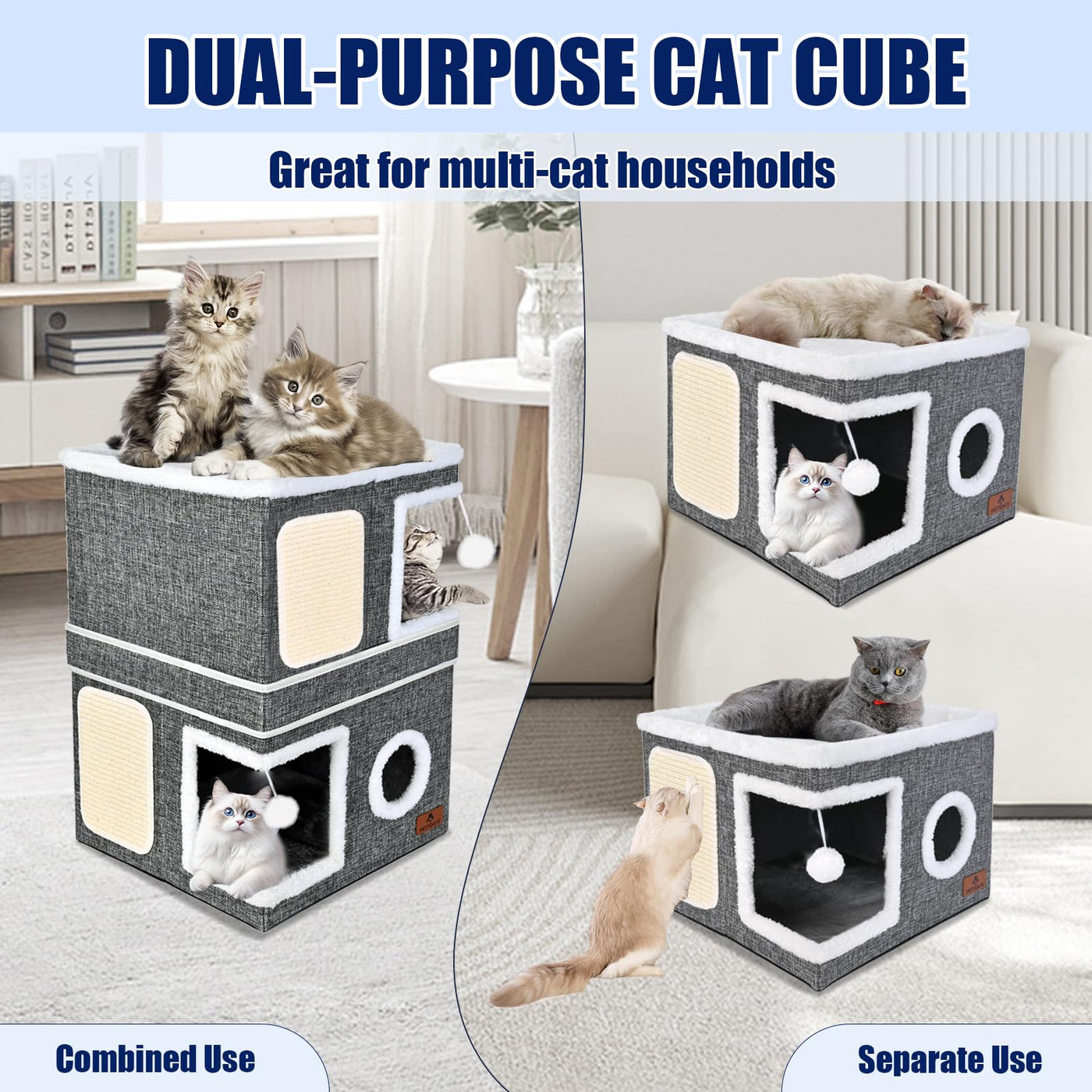 2-Story Cat House For Indoor Cats, Dual-Purpose Cave Bed With Scratch Pad And Fluffy Ball, Foldable Cat Hideaway, Cute Condo Fur