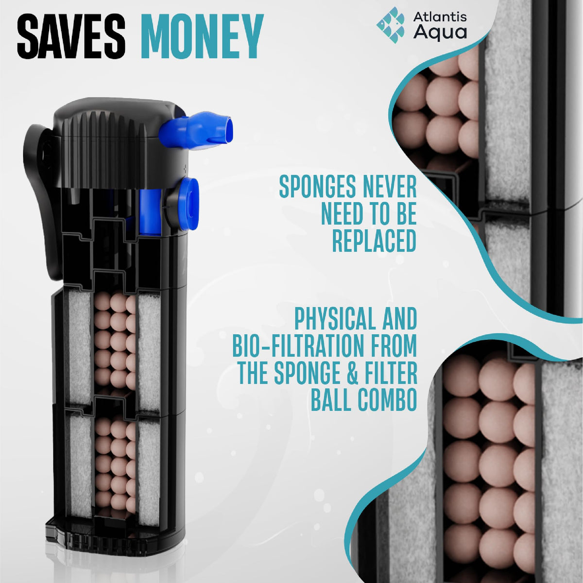 CRYSTAL CLEAR WATER - Unlike other fish tank filters on the market the Atlantis Aqua submersible aquarium filter draws water through the bottom of the filter rather than the sides. This means the water travels through the full fish filters system rather than taking the easiest path and being partially filtered like other fish filters.