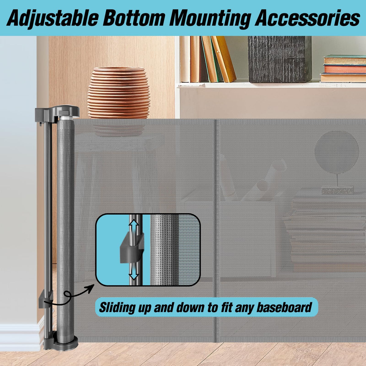 Why Choose Our Retractable Gate? - Standing 24'' tall: This short dog gate is ideal for use with toddlers and small pets. Adults can easily pass through without having to take the puppy gate down. - Adjustable Width:The width of the mesh can be flexibly adjusted between 0-55 inches and retracted effortlessly. - Retractable & Space Saving: Mesh can be completely retracted away when not in use, saving your space. - No Tripping Hazards: Unlike iron gate rails, our retractable baby gate has no bottom rails - so there's no tripping hazard. - Reinforced Support Rods: Built-in reinforced support rods, stable and durable, not easy to deform. Enhances the load-bearing capacity of the short pet gate. - Durable & Scratch-Resistant Mesh: Sturdy and durable mesh is designed to withstand the scratches of your pet's claws. - Floor Adhesive Hook: This small dog gate comes with a floor adhesive hook which can keep your baby or pet from crawling through the bottom of the short gate. - Child Safety Lock: The double lock design ensures the pet gate is securely closed, providing an additional layer of protection. - One-Hand Operation: The one-handed operation allows you to open and close mesh baby gate while holding your child or carrying something. - Easy to Install & Removed: Mesh dog gate can be quickly installed and removed out of the opening for storage. - Adjustable Mount Fits Any Baseboard: The lower mounting bracket of the retractable dog gate can be slid up and down to fit any baseboard heights, making installation faster and easier. - Babies and Pets: Can be used as a baby gate and a doggy gate to prevent mischief by providing a safe, closed off environment to play. Suitable for babies and small pets. - Perfect Fit Indoor and Outdoor: This puppy gate for the house is suitable for doorways, hallways, stairs, living room, kitchens, balconies, indoor and outdoor.
