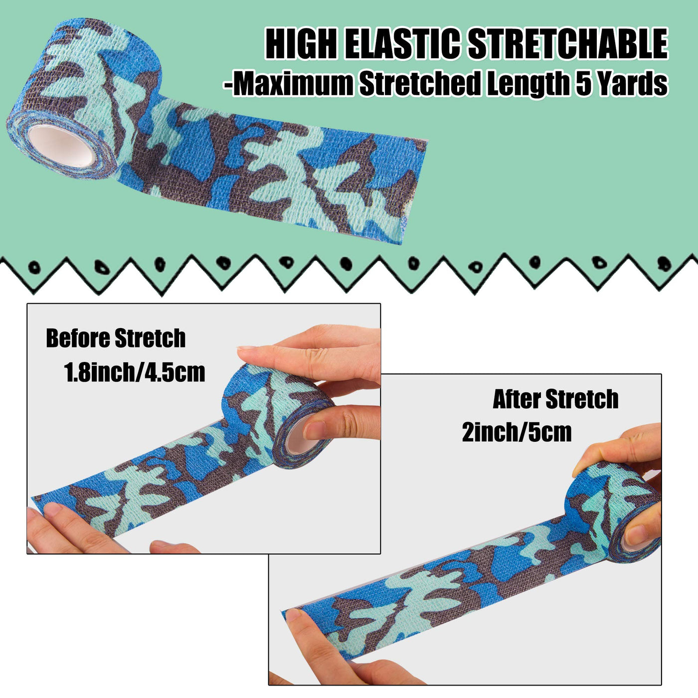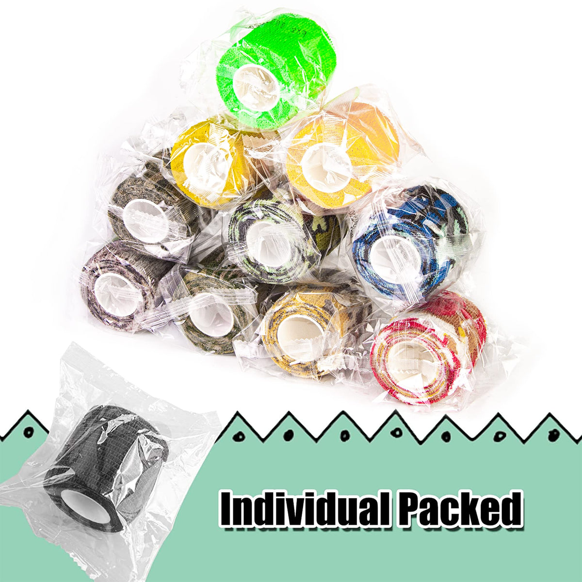Product description Self-Adhesive Bandage Easy to wrap, can be torn with hand, no need to use scissors, which is breathable and safe for your skin. Besides, they are lightweight and easy to carry, very convenient for you to use. Wrap is adherent without any odor or sticky residue - which is especially helpful for sensitive skin. Lightweight Breathable Material Porous fabric allows for ventilation so the skin can breathe underneath, which is good for the skin and better for healing Wide Usage They are suitable for pets body parts, such as ankle, wrist, finger toe, elbow, knee and so on, can provide for swelling, dressing wounds, sprain and general soreness. Besides, this sanitary, non-elastic bandage also works as a wrap ideal for person. Use Suggestion Do not bandage the last turn contact with the skin, and it should be completely cover the front turn, to ensure a good fit. Plus, do not wrap the bandage to the wound directly, should be covered with sterile excipients after disinfection, and then bandaged. Specification: Width: 2 inch Length of each roll: 5 yards Quantity: 24 rolls Material: porous fabric Color: 24 colors, include Solid Color (8), Pattern (8), and Camouflage (8) Please feel free to contact us if you have any questions. Thank you!