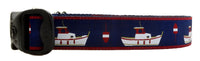 3 Dirty Dawgz Preppy Nautical Lobster Boat Dog Collar is the perfect collar for your boat loving dog friend. Your pup will be sure to look awesome while wearing this preppy collar while setting up your lobster traps! This Maine Boating dog Collar features a preppy design with lobster boats in shades of white and burgundy against a navy blue ribbon background. We promise your dog will be the best dressed First Mate while out and about cruising through the waves of the sea!