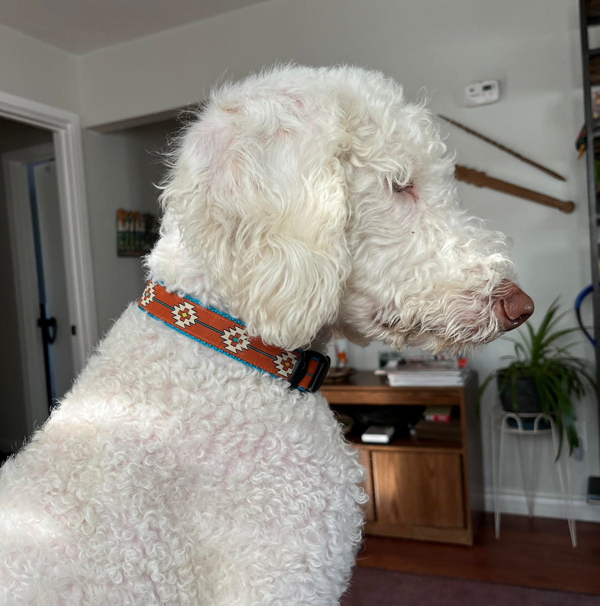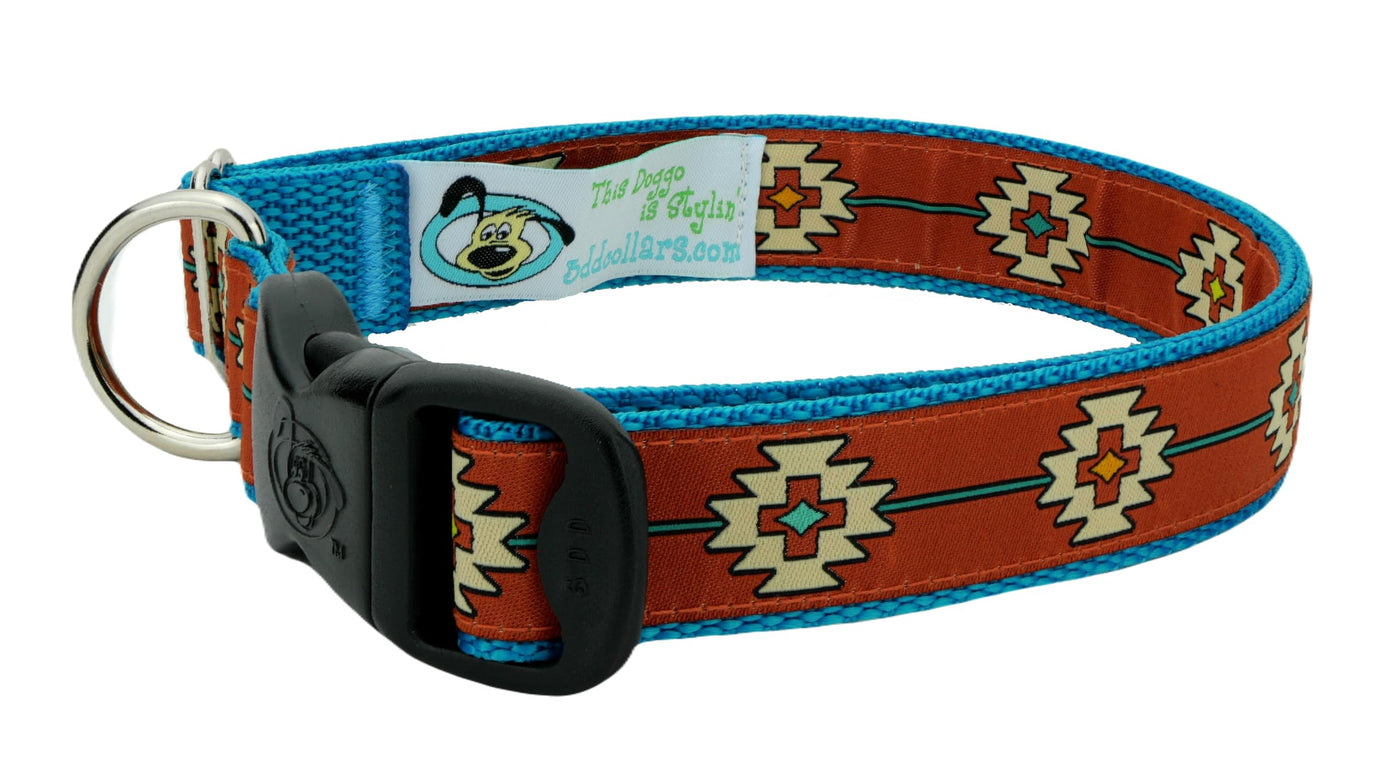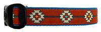 3 Dirty Dawgz Southwestern Navajo Dog Collars will have your dog walking the neighborhood in style with this gorgeous Santa Fe inspired design. This Western Dog Collar features a Southwest design in shades of turquoise tan orange and green against a clay orange ribbon background. This Pueblo Dog collar will surely be the hit of the dog park!