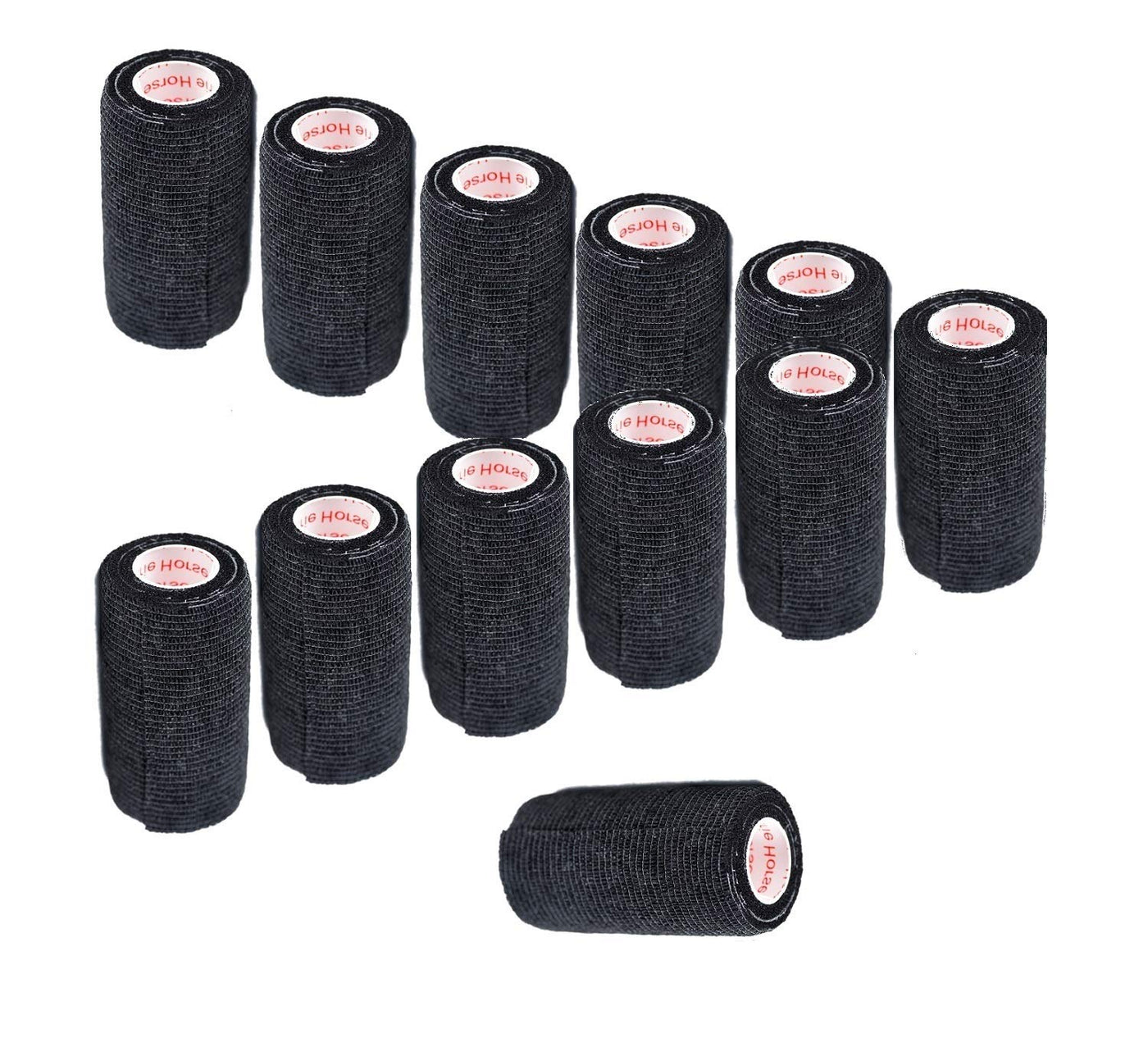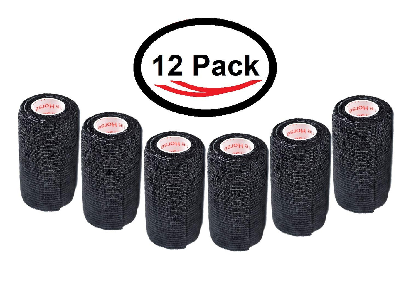 3 Inch Vet Wrap Tape Bulk (Black) (Pack of 12) Self Adhesive Adherent Adhering Flex Bandage Grip Roll for Dog Cat Pet Horse