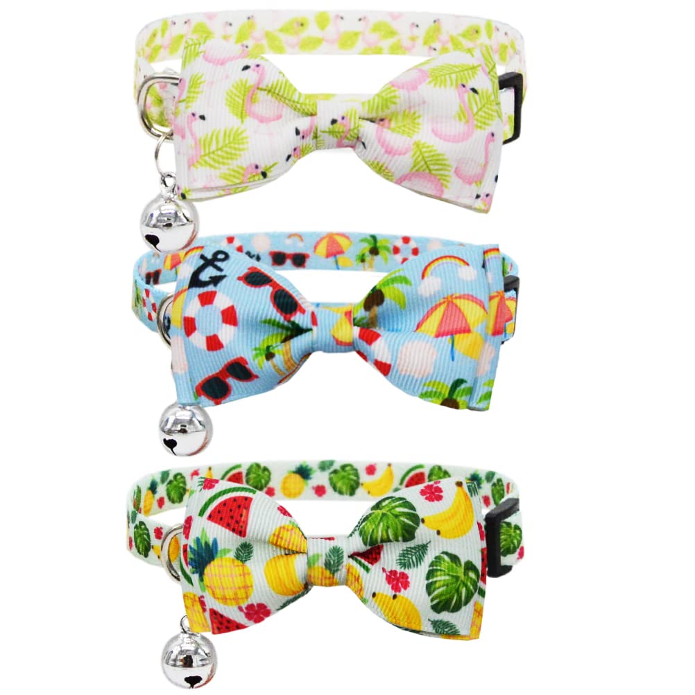 3 Pack Hawaiian Breakaway Cat Collar With Removable Cute Bow Tie And Bell Adjustable Safety Buckle Fruit Flamingos Hawaiian Styles