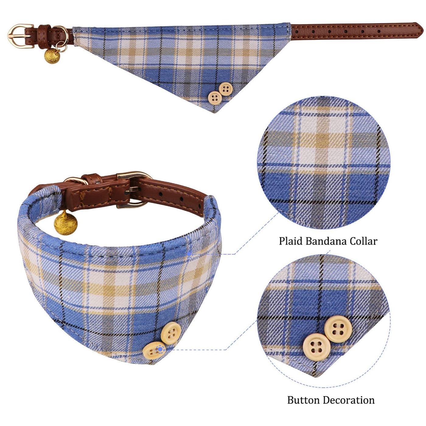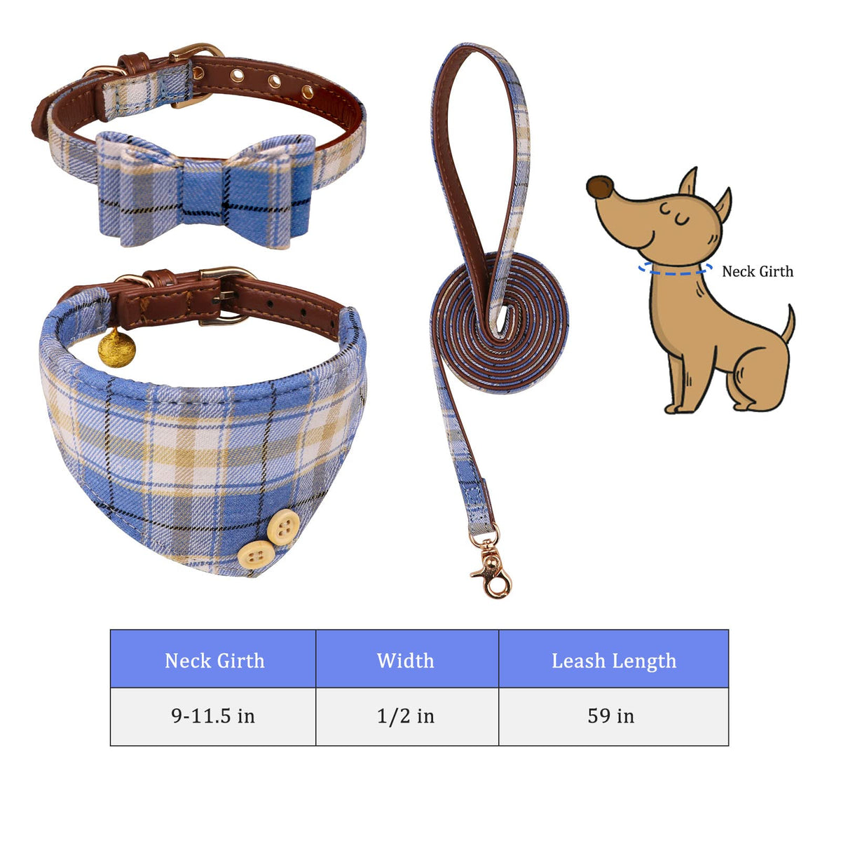 erfect combination--You will get a bow tie collar a bandana collar and a leash Whether its dressing up your dog on different occasions or when you take your dog out this combination can meet your needs which is both fashionable and practical Adjustable Size--Fit for small dogs puppies and cats The neck girth of our collars is 9-115(6 hole adjustment) and the length of our leash is 59 Please measure your pets neck circumference before buying to make sure it is suitable for your pet Ultimate comfort--Our puppy collars and leash set are made of extremely soft PU leather to make your puppy more comfortable and will never hurt your petAs neck Easy to grip handle is comfortable on your hand Just enjoy the fun of walking with your puppy urable Accessories--The buckles clasp D-rings and bells are all made of golden metal material which is not only durable but also more upscale The 360A freely rotating clasp will not entangle your puppy The bell will make a crisp sound and can be removed Blue Plaid Pattern--This blue plaid pattern is our companys original design We have designed different color plaid patterns to meet your personalized needs and each plaid pattern is very simple and fashionable Will make your small dog more different and unique