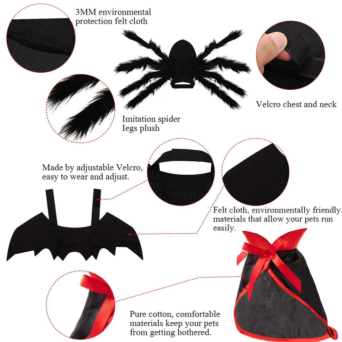 Q: What different styles does the costume set include?A: The 3 Piece Halloween Cat Dog Costume Set includes a giant imitation spider wing, a bat wing, and a witch vampire cloak. This variety allows you to change your pet's look for different Halloween themes, from spooky to adorable.