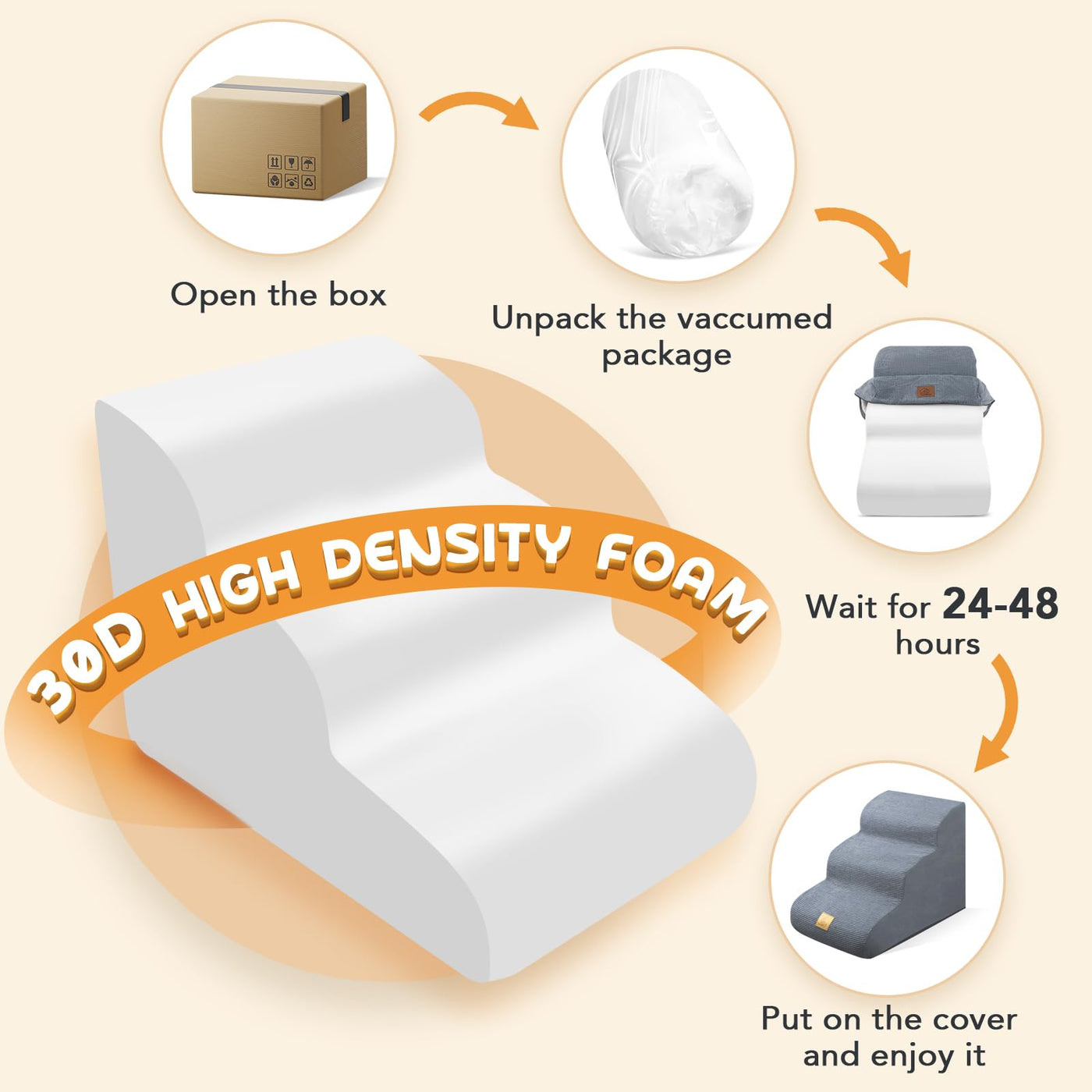 Q: Is the foam material durable and safe for pets?A: Yes, the stairs are made from 30D high-density foam which is designed for durability and rapid rebound, supporting pets weighing up to 60 lbs. It is also highly breathable and odor-free.