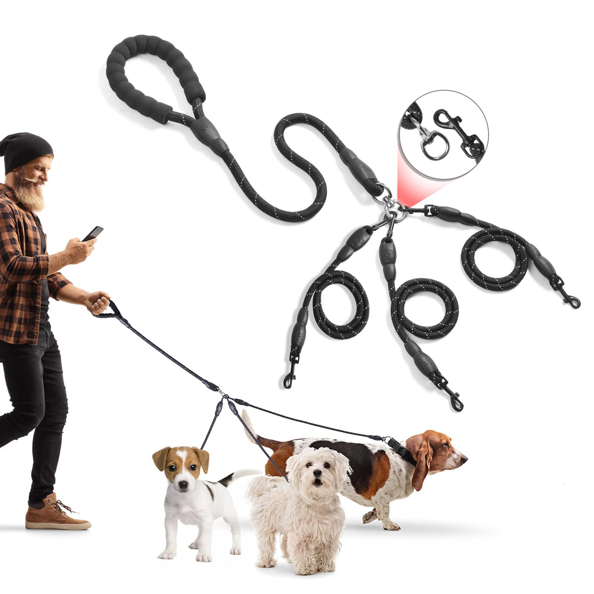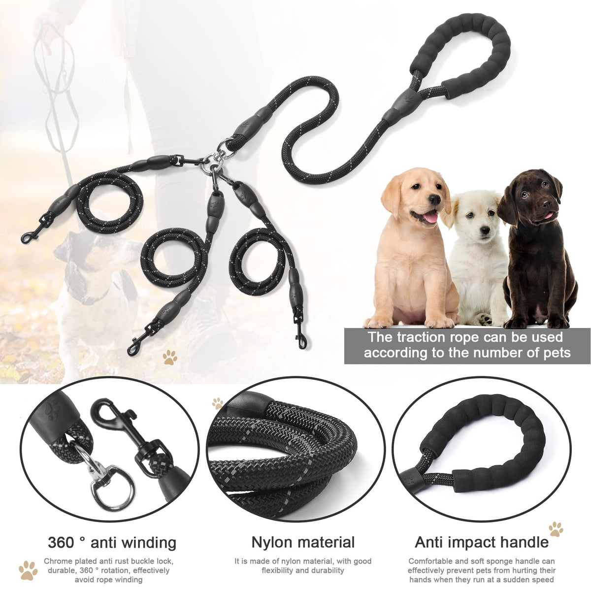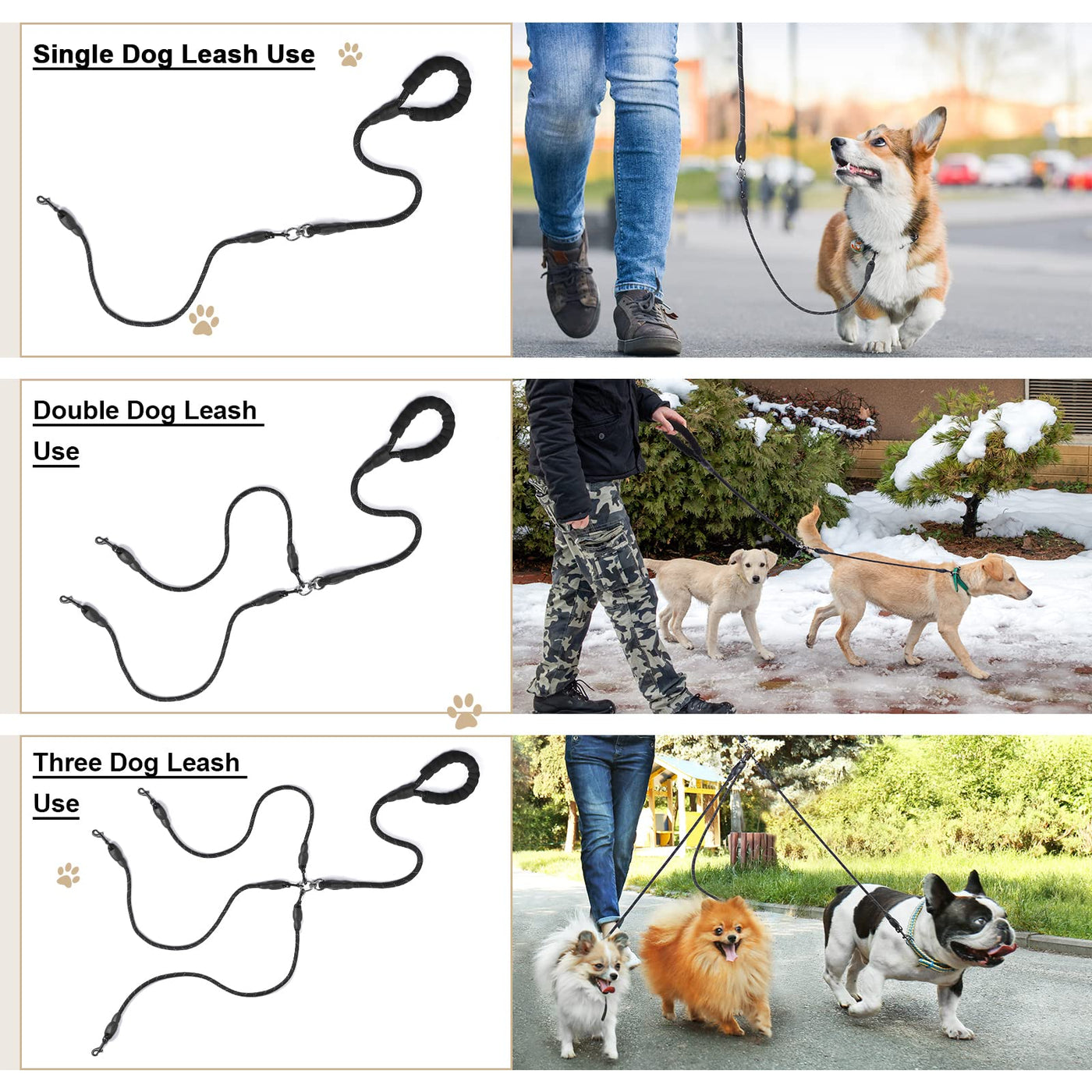 Well-constructed: Dog leash is made of polyester material strong lightweight and heavy duty No Tangle: This swivel clasp design allows for auto adjusting when dogs criss cross Dogs can move back and forth easily thanks to this no tangle design AMultifunctional Use: Our Multi-function can be use as double dog leash or three way dog leashPerfect to control 3 dogs non tangle You can walk and control 2 dogs or 3 dogs at once while maintaining safe control over all Soft grip: comes with soft foam handle easy to hold on designed to protect your hands Please do not use it to walk thee dogs over 110 lb totally otherwise it might cause cord to break