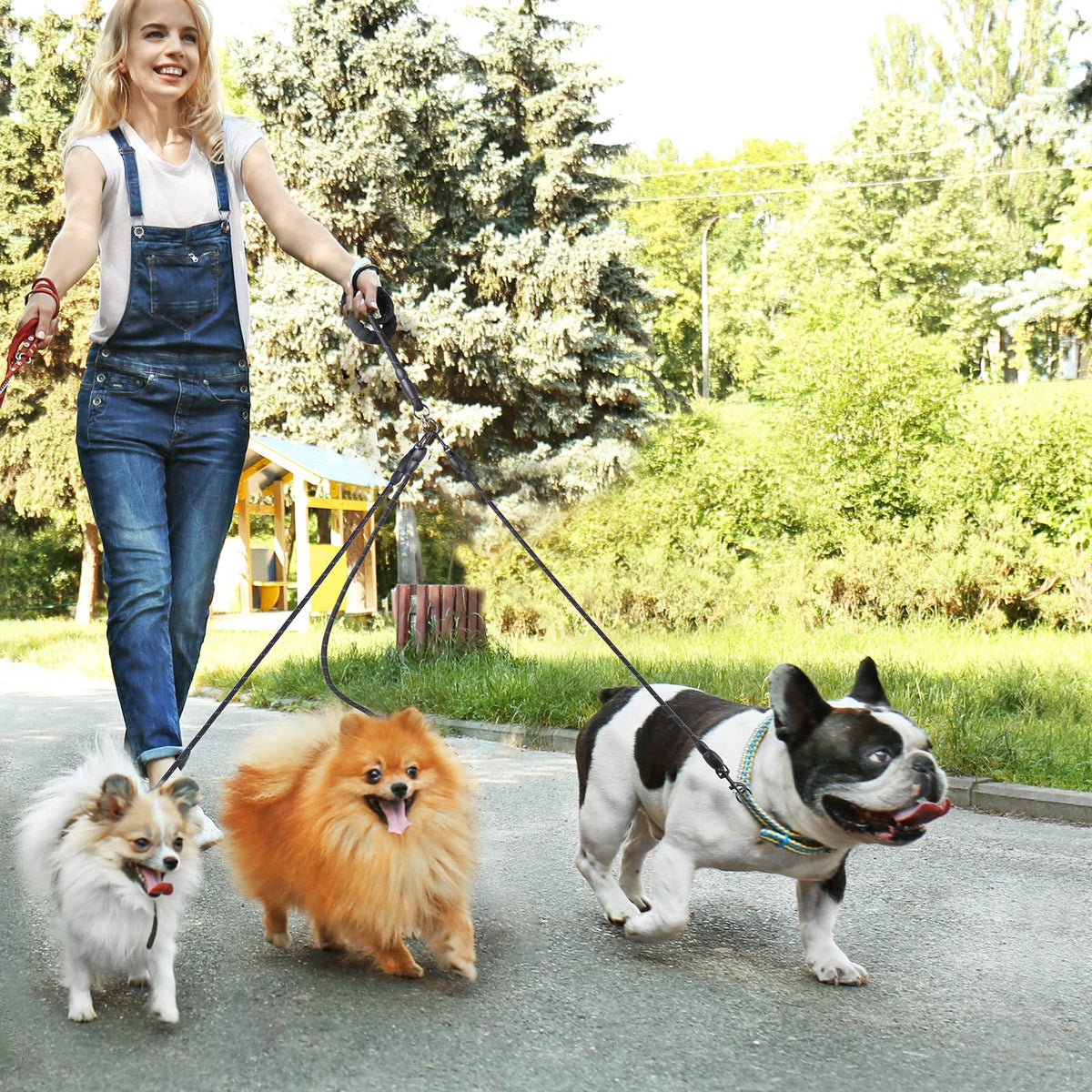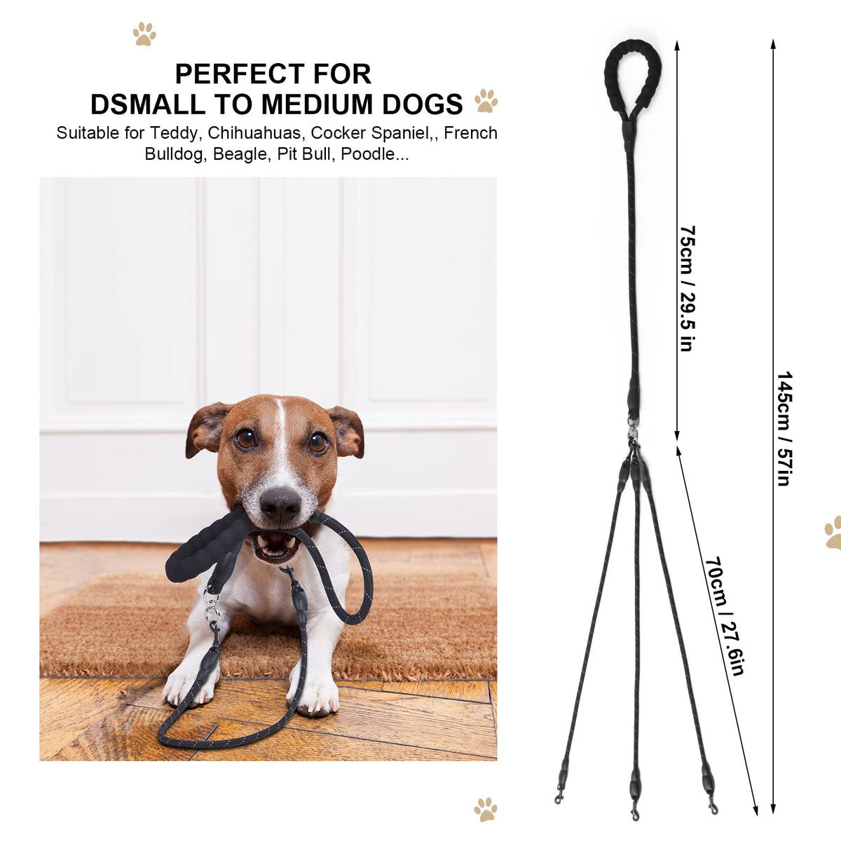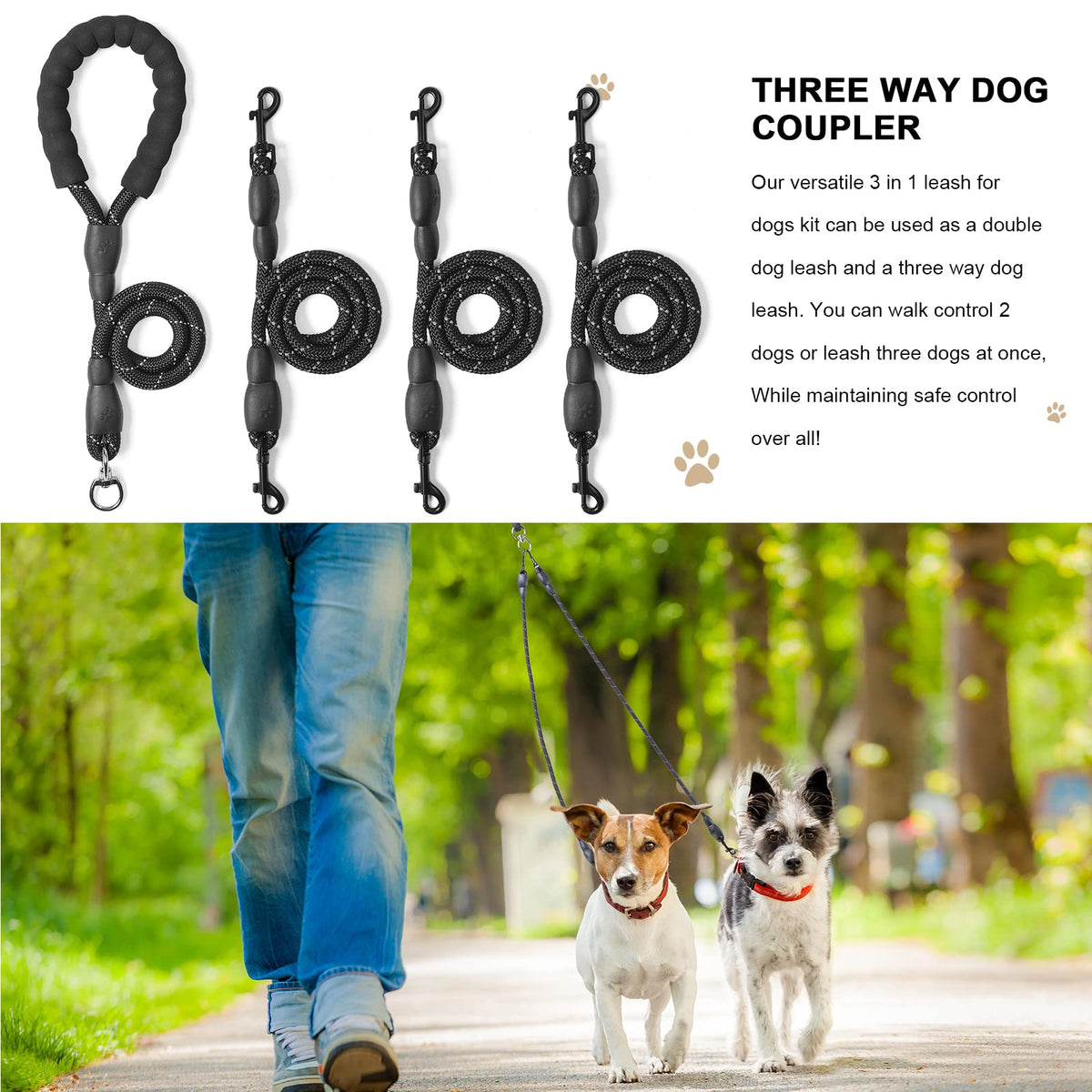 Well-constructed: Dog leash is made of polyester material strong lightweight and heavy duty No Tangle: This swivel clasp design allows for auto adjusting when dogs criss cross Dogs can move back and forth easily thanks to this no tangle design AMultifunctional Use: Our Multi-function can be use as double dog leash or three way dog leashPerfect to control 3 dogs non tangle You can walk and control 2 dogs or 3 dogs at once while maintaining safe control over all Soft grip: comes with soft foam handle easy to hold on designed to protect your hands Please do not use it to walk thee dogs over 110 lb totally otherwise it might cause cord to break