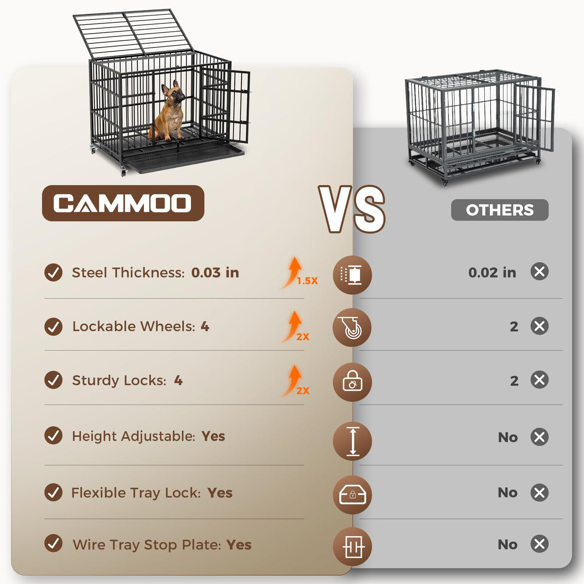 The Cammoo 38' Heavy Duty Dog Crate Is Suitable For Small And Medium High-Anxiety Dogs. Made From Durable Steel, It Features A Rust-Resistant Finish For Safety. With Adjustable Lockable Wheels For Easy Movement, Removable Waterproof Trays For Quick Cleaning, And Secure Locking Doors, This Crate Ensures Comfort And Security For Your Pet.