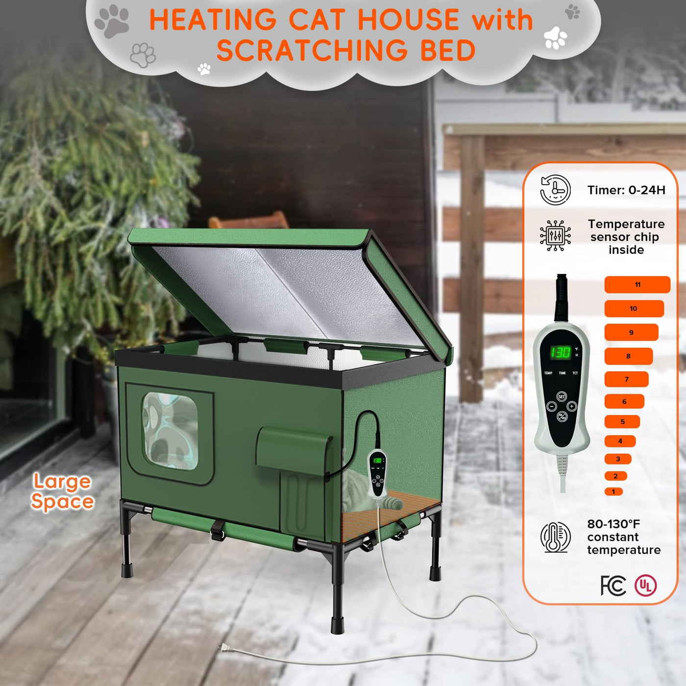 4-In-1 Heated Cat House For Outside With Heating Pad, Scratching Bed And Elevated Bed, Waterproof Windproof Tpu Rain Cover, Larg