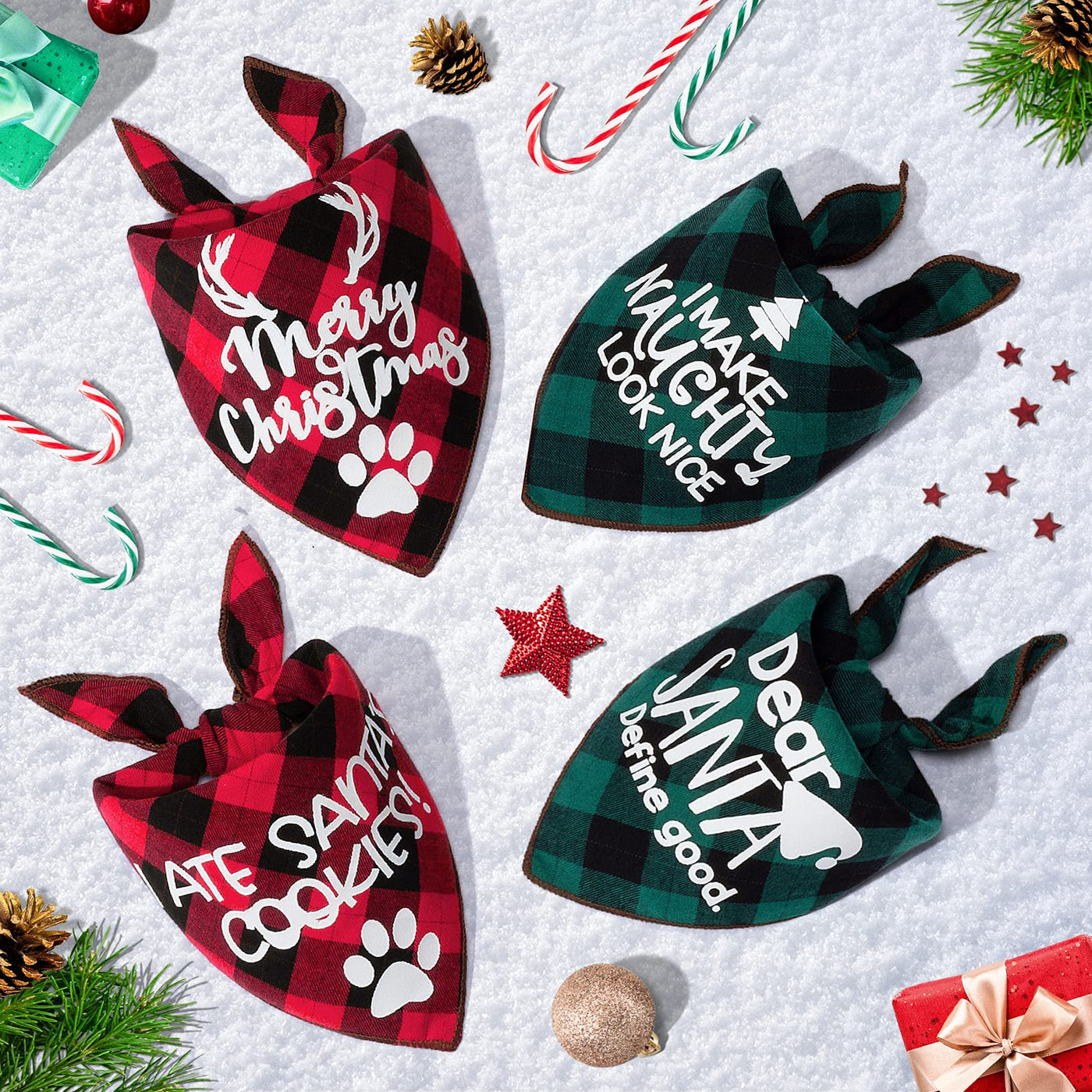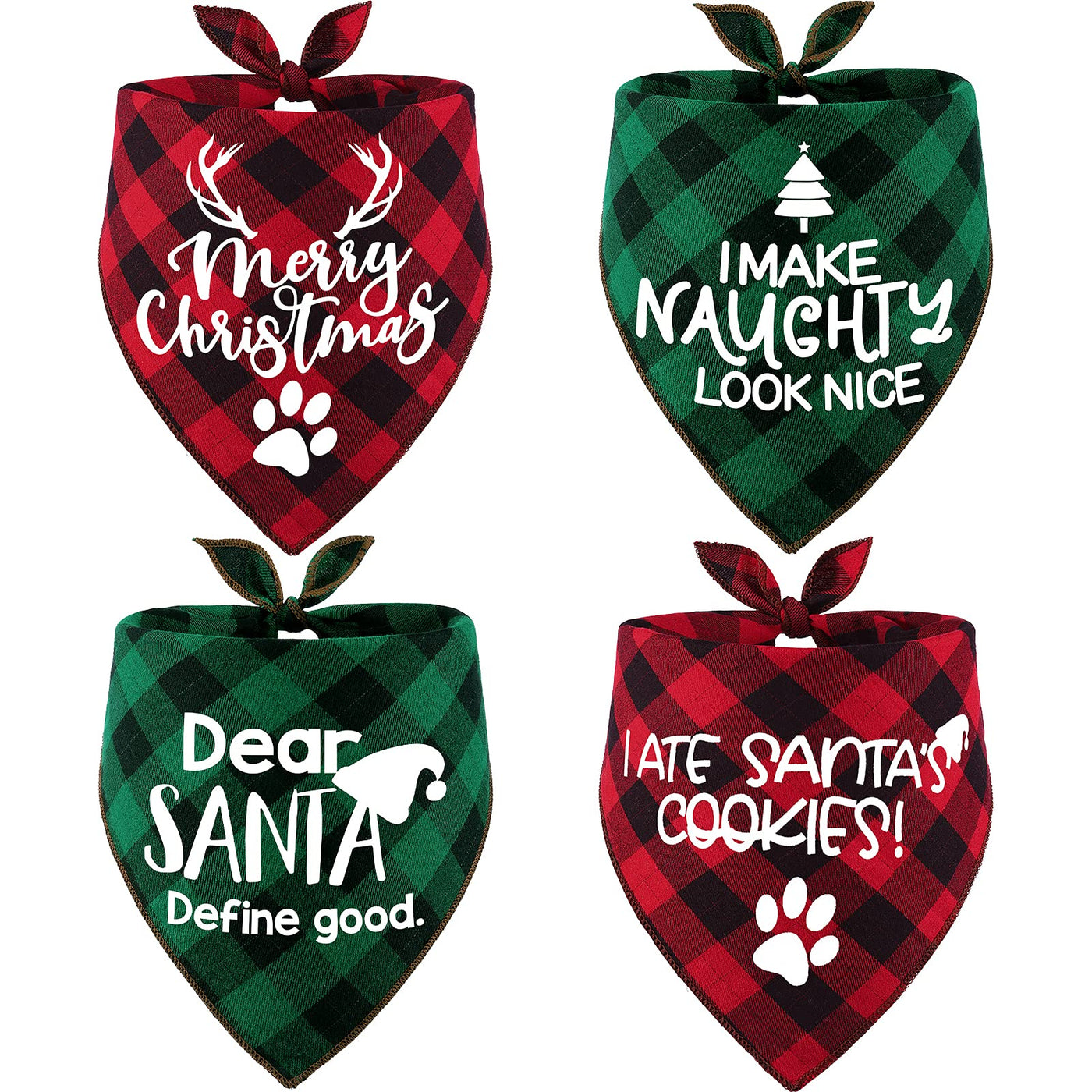 Unique Design & Features - With the 4 pcs of different design christmas slogan pet kerchiefs, you will get 8 styles for your pets actually. - Back side classic lattice plaid make the item classic and brings more fun in daily! - High quality material made the bandanas super absorbent, breathable and comfortable. - Size: Base 26“ x hypotenuse 17”, Suitable for dog's neck size up to 21”. Please measure the size of your pets and leave room to tie knot. - Printing slogan: 'merry christmas', 'I ate santa's cookies', 'i make naughty look nice', 'dear santa define good'.